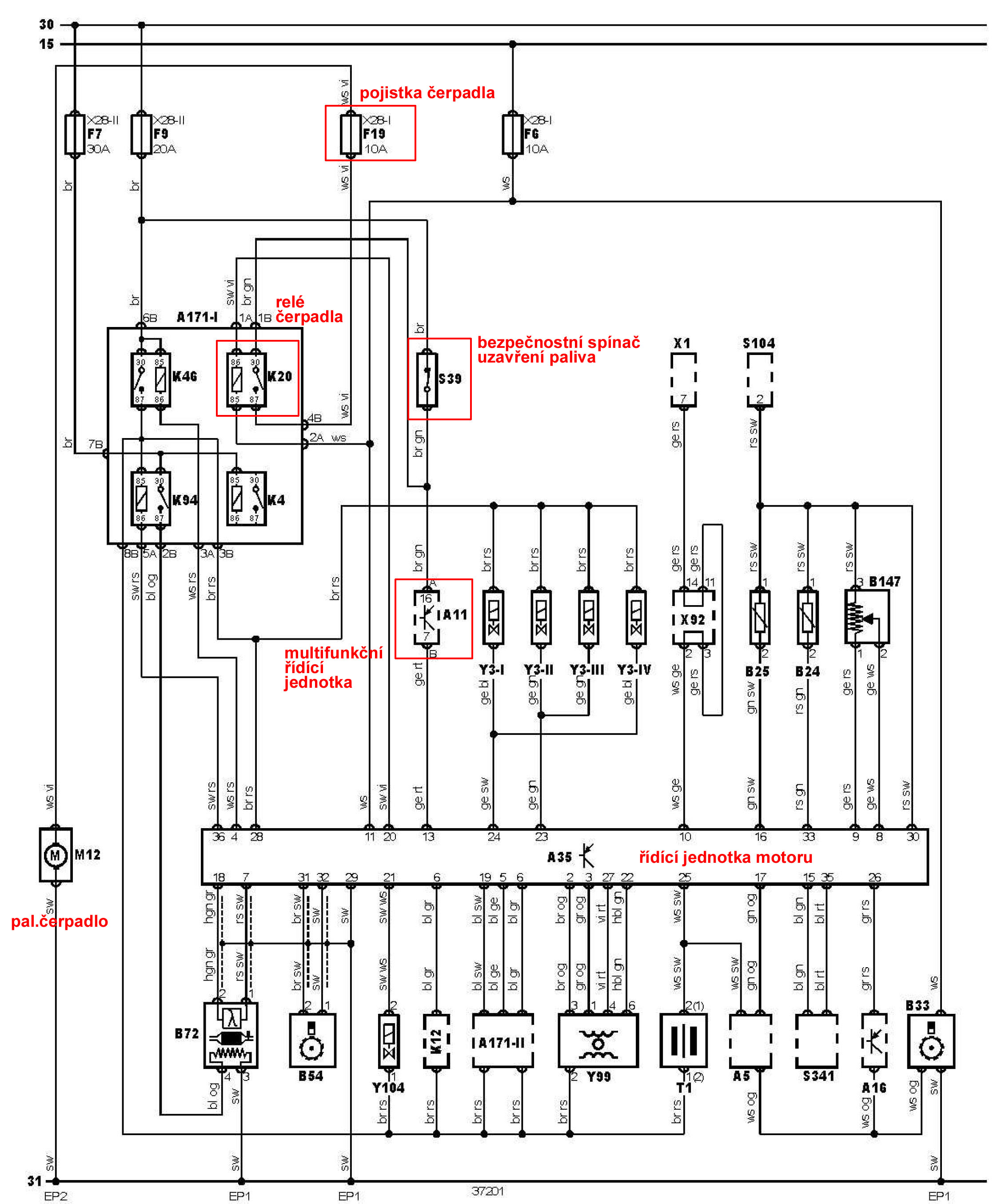 Signál dává ŘJ motoru. Okruh je kromě pojistky jištěn bezpečnostním spínačem uzavření paliva (rozpojí obvod čerpadla). Možná by mohl být problém v něm.