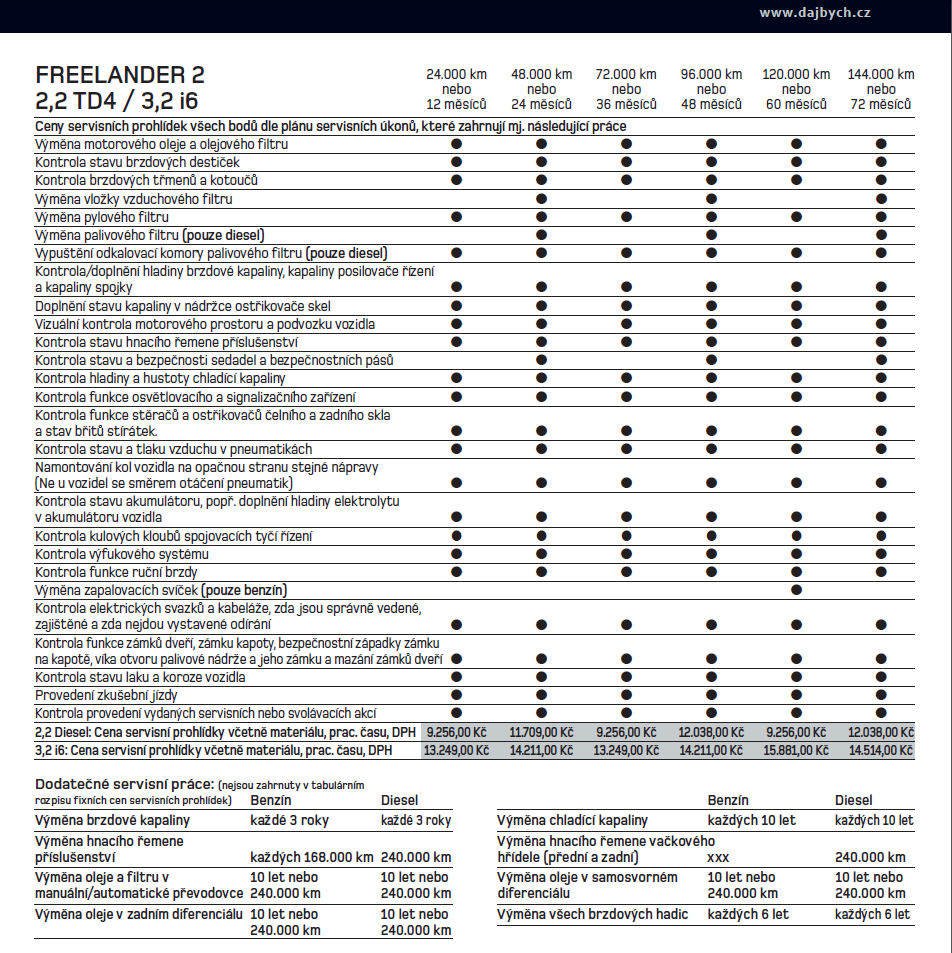Přikládám seznam servisních úkonů, pro představu, jen naplně převodových ústrojí bych zkrátil max na 60000 a olej v motoru na 15000