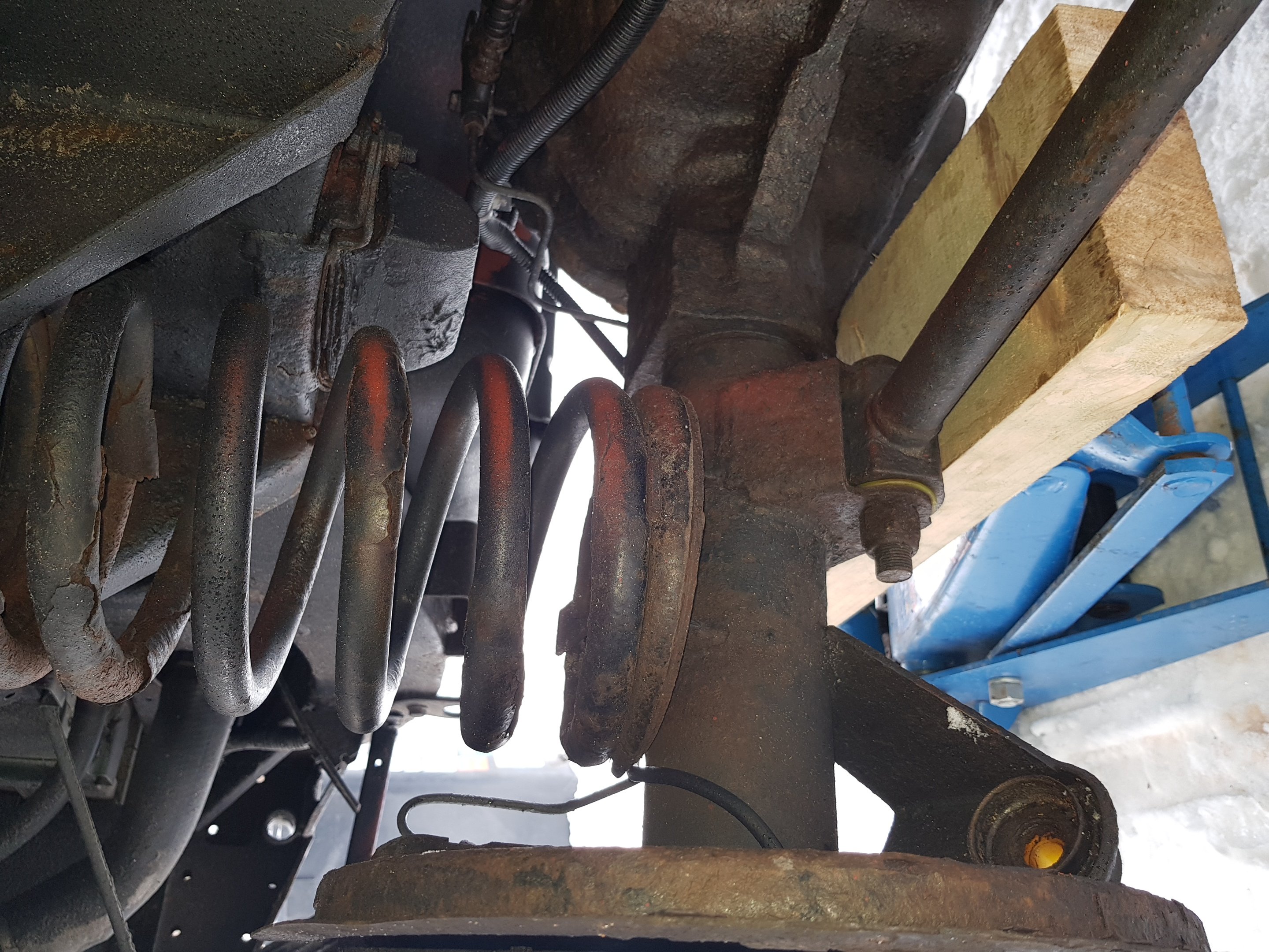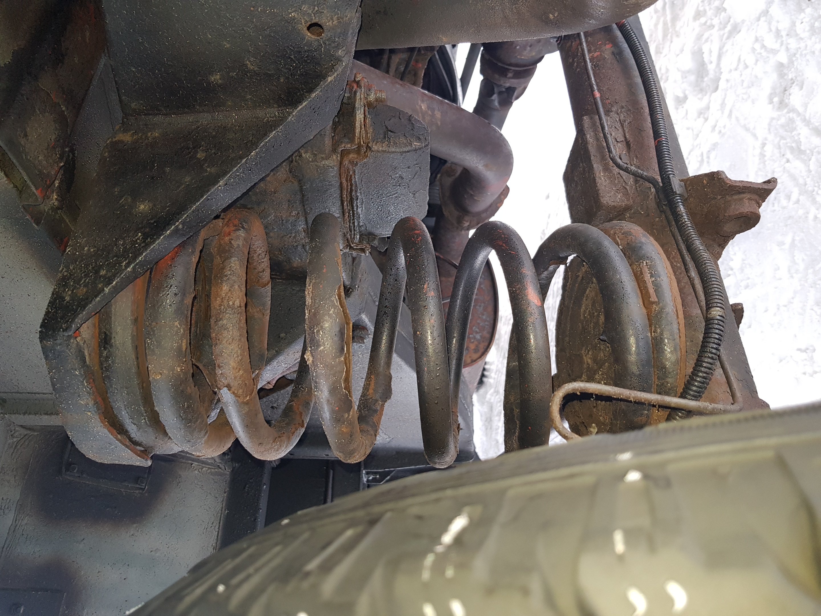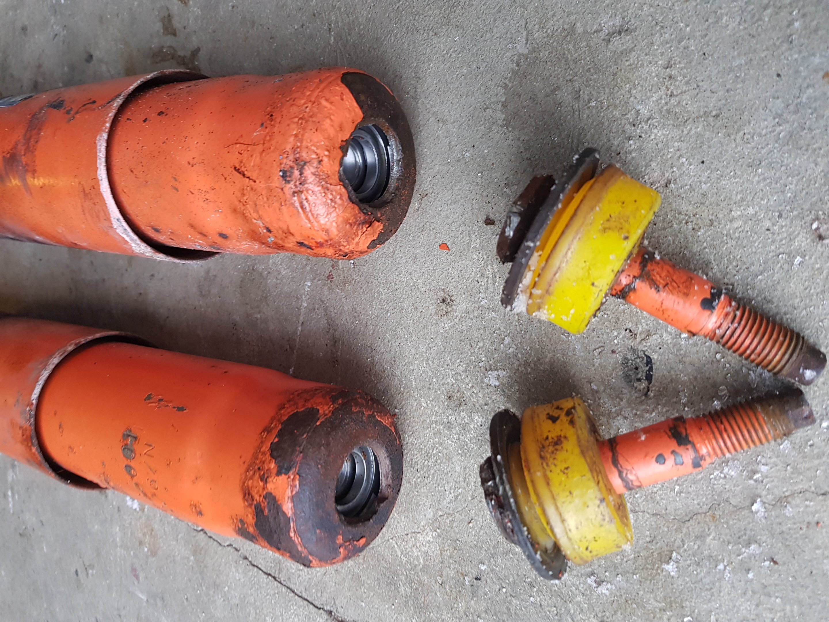 Mě to připadá, že ty lomové plochy jsou orezlé, takže to není jednorázový lom, ale postupné prasknutí. Co takhle dorazy nápravy, jsou tam, a jsou funkční? Jinak jako dorazy fungují ty tlumiče a to jim rozhodně moc neprospívá. A v kombinaci s unavenýma pružinama a naloženým autem to může takto dopadnout.