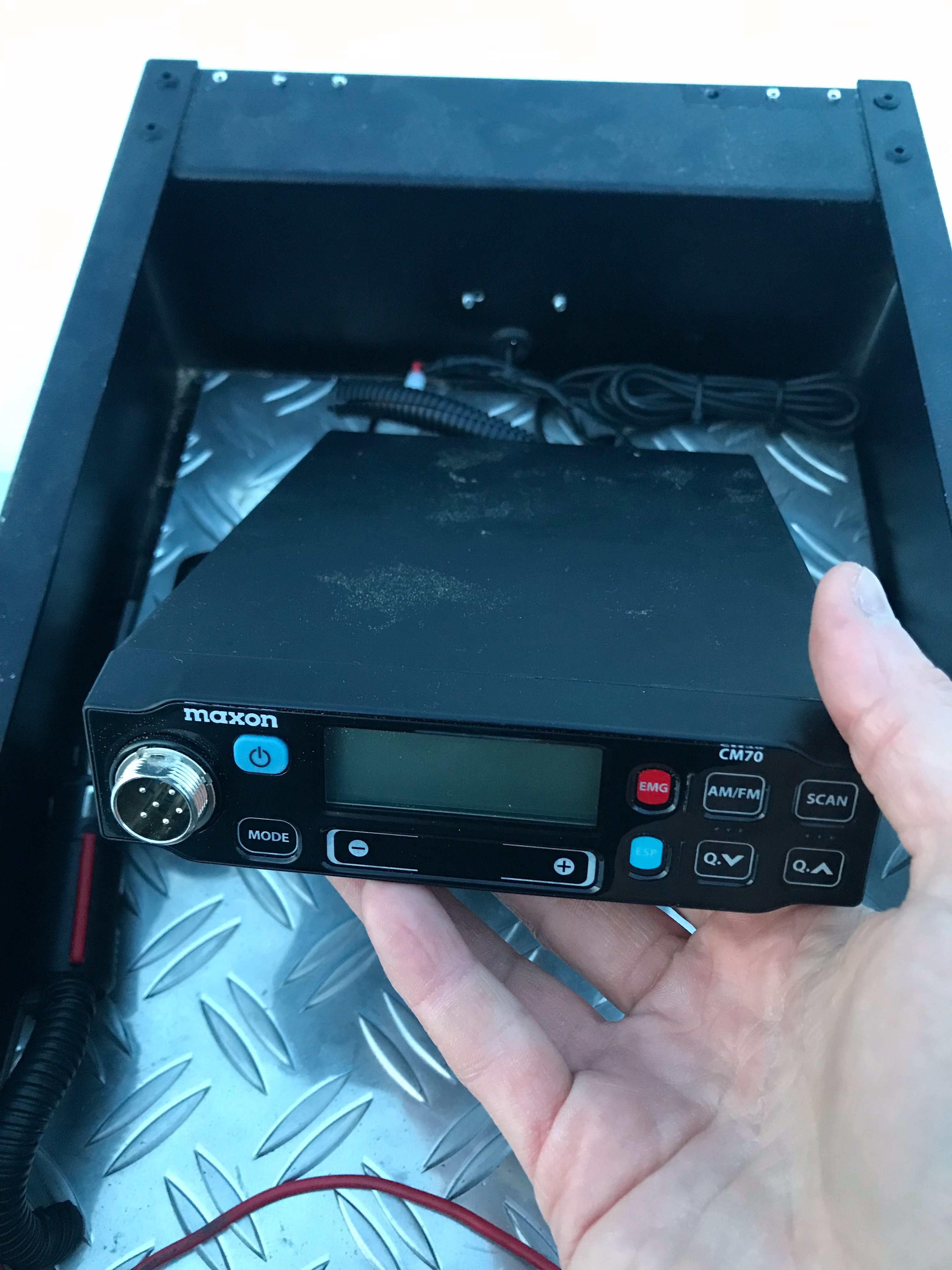 Podobně na míru dělaná kastle/box na vysílačku s umístěním pod cubby box. Jednak to hezky ten cubby vyvýší a jednak je to celkem pěkné a praktické umístění vysílačky. Já to vyměnil za box na bufíka, takže kdyby někdo měl zájem rád přenechám, ideálně včetně vysílačky maxon!