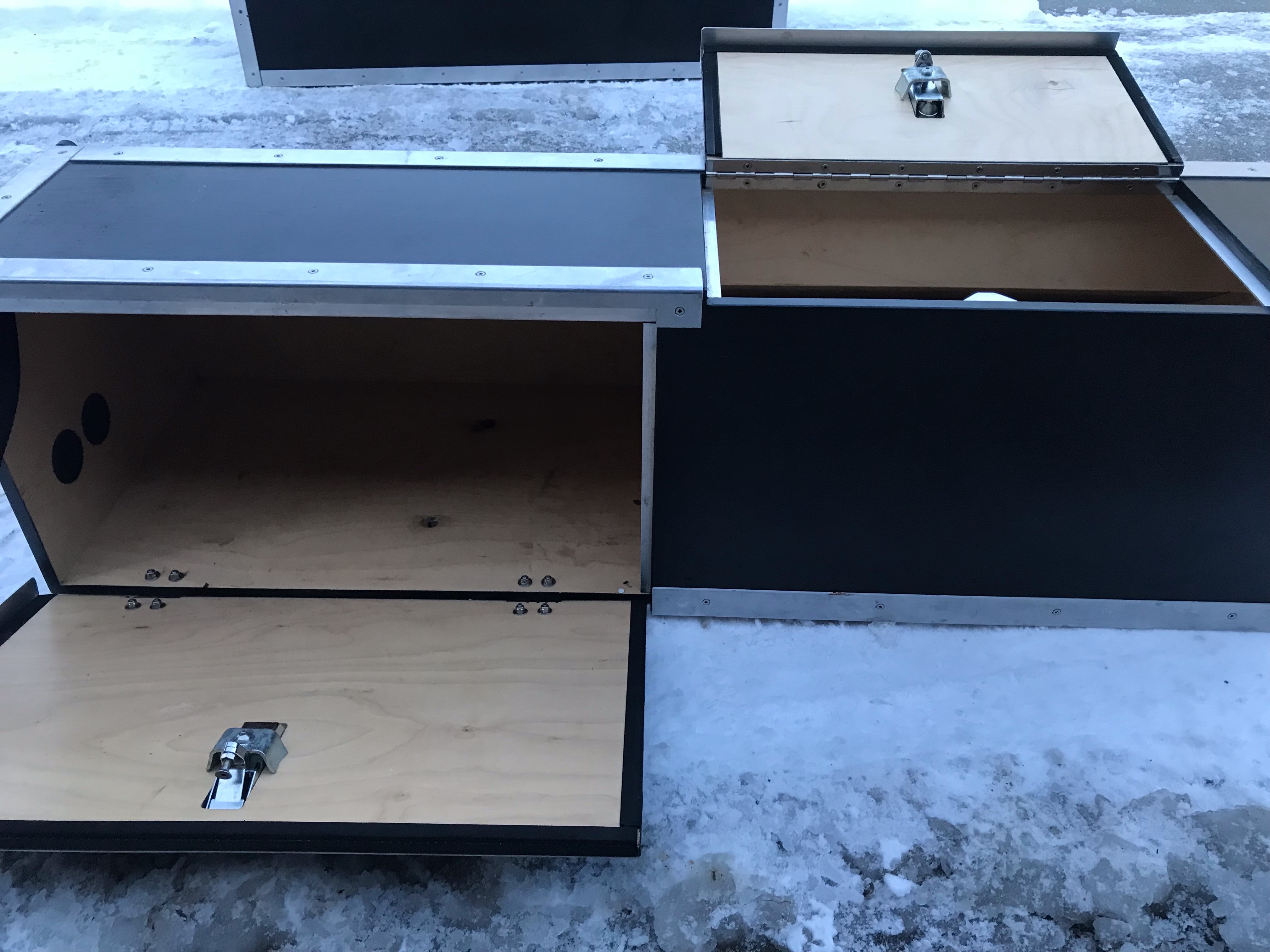 2 boxy/bedýnky dělané na míru do defika 110 na oba blatníky. Opravdu poctivá práce, co vydrží a vydržela. Z voděodolné překližky s kováním, vychytané. Já je už nevyžiju, do defika půjde vestavba na míru tady ve spolupráci s jedním zdejším uživatelem na což se velmi těším a snad se budu moct brzy pochlubit. :grin: