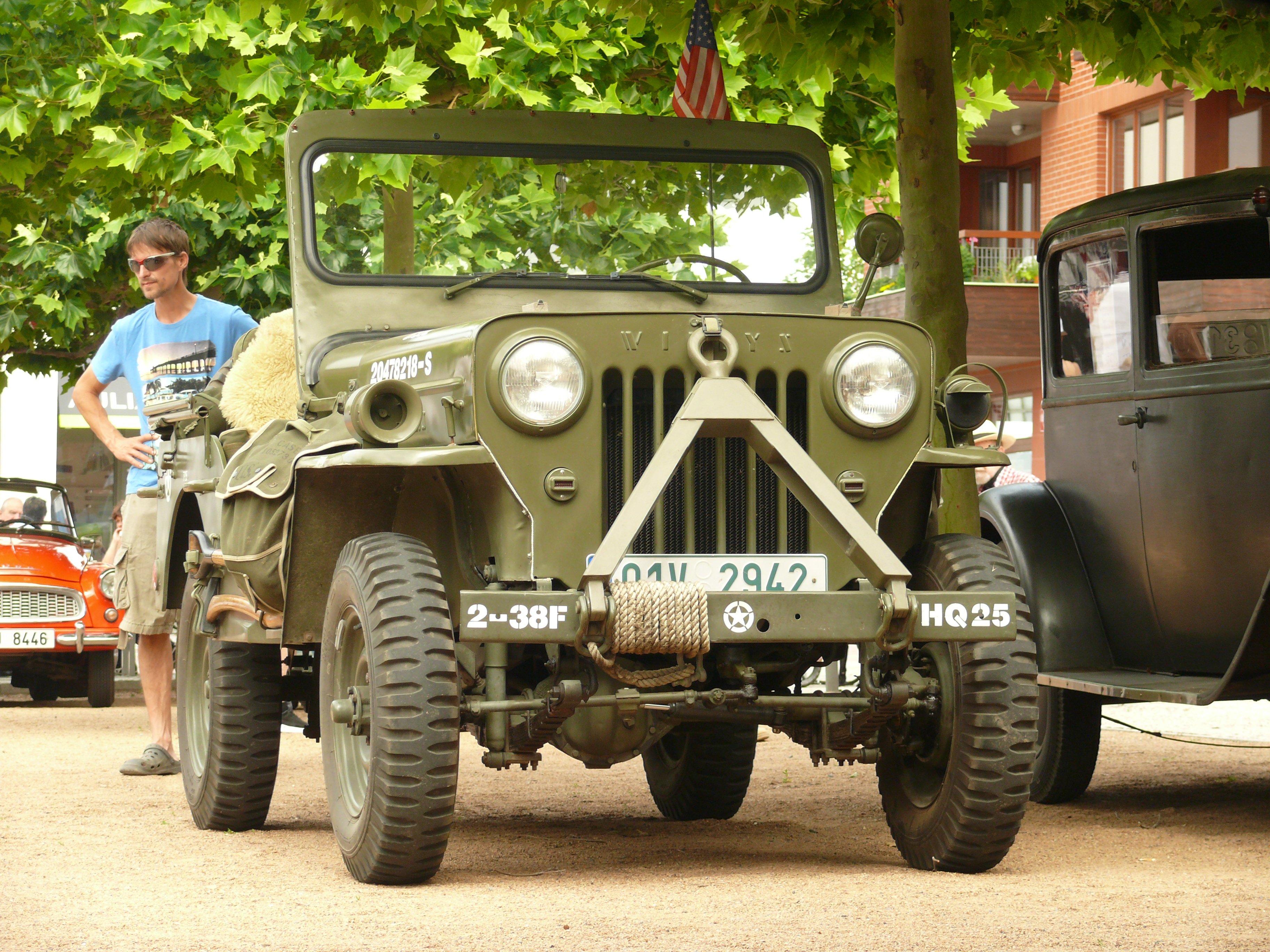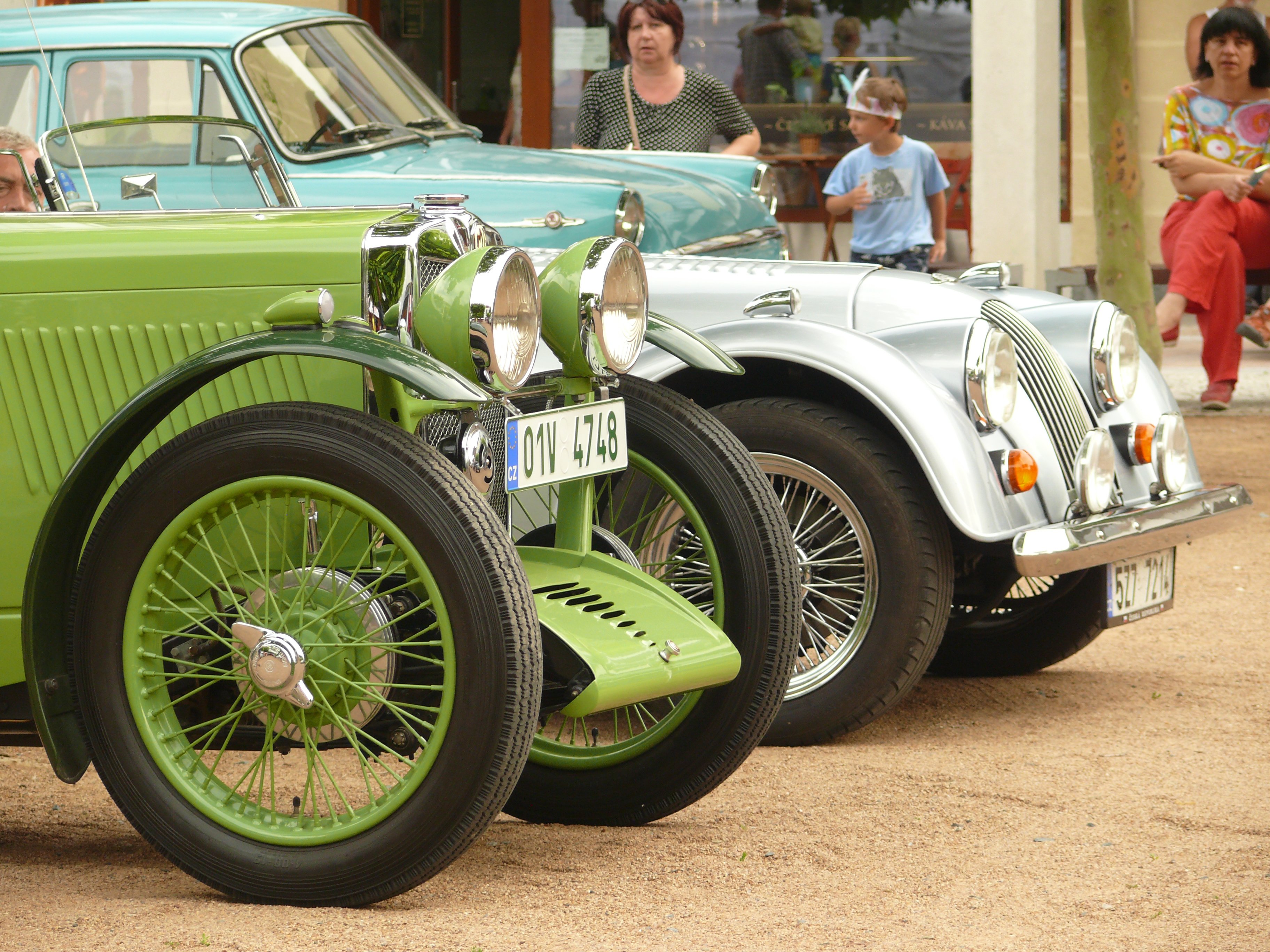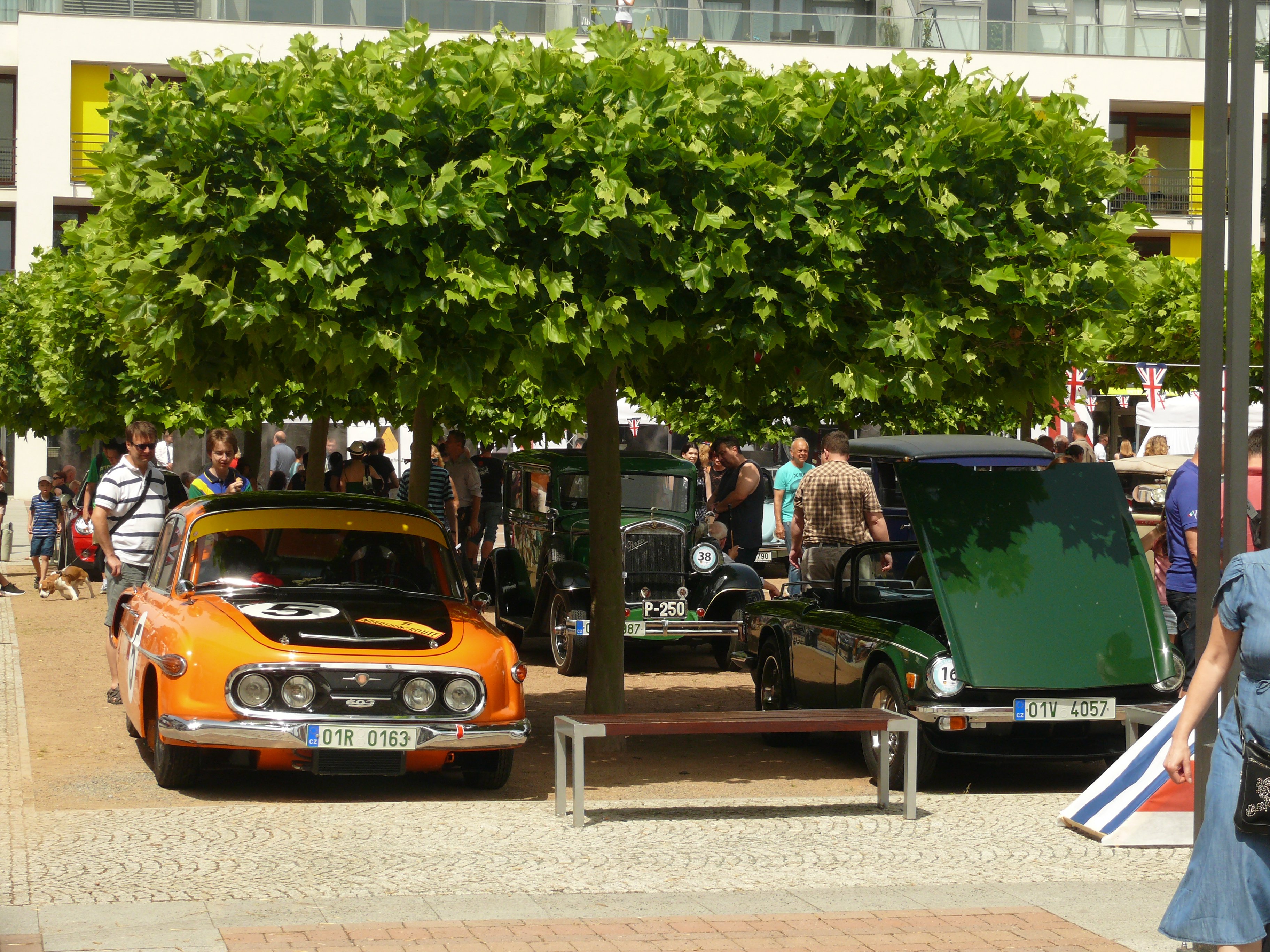 Stejně jako před 2 lety bylo horko na chcípnutí, tj. dolnobřežanské náměstí bylo rozpálené do běla - po příjezdu jsem si našel krásný flek pod stromem, ale protože jsem byl pořadatelem vybrán, musel jsem zaparkovat vpředu mezi ostatním výběrem britských vozidel. Společnost Jaguaru E-Type, Mini, Lotusu Super Seven (nebo jeho repliky) a Morganu 8 byla čestná, nicméně tam celou dobu výstavy pralo slunce a Pekelník byl rozpálený jako pětikoruna i v klidovém stavu