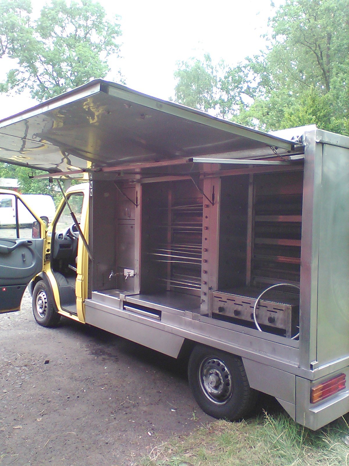 rv. 2004, najeto 247000 km, diesel 60kw, do 3,5 t, nerezová nástavba se dvěma grily cca na 120 kuřat, jedním přídavným stolnim na bajonet plynovou hadici, 10ks jehlic, mrazící boxy, nádrž na vodu, hygienický koutek, nádrž na plyn 116L, prodejní stůl, pevné bočnice k přístřešku, místo pro elektrocentrálu, nebo připojení 220 v, úložné prostory, vše funkční více na telefonu.doklady SRN. stk 5/2020, více stejných vozů v nabídce, cena 222000,- Kč, rychlé jednání - možná dohoda, registraci v ČR zařídím.vice na tel. 608255755, Karlovy Vary