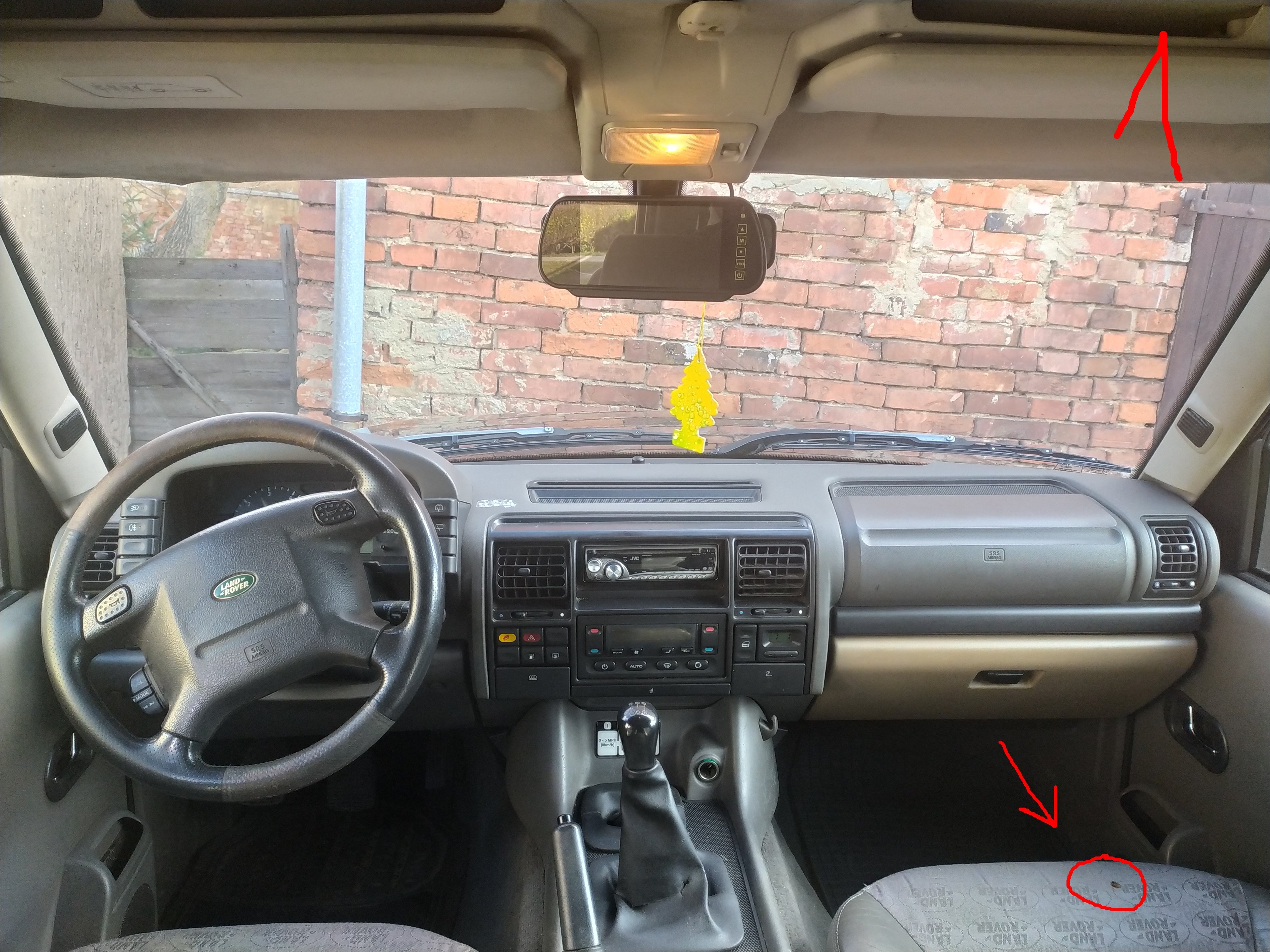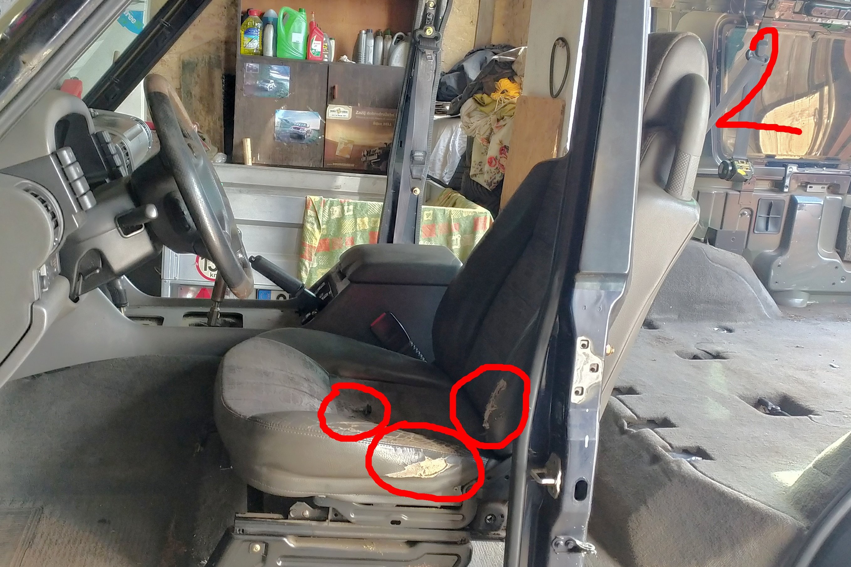 5 místný, polokůže, tmavý s logy LR, sedačka řidice škubnutá na sedáku a prodřené boky sedáku i opěráku (foto 2), sedačka spolujezdce propálený sedák, jinak v pořádku (foto 1), zadní bez poškození (foto 3)