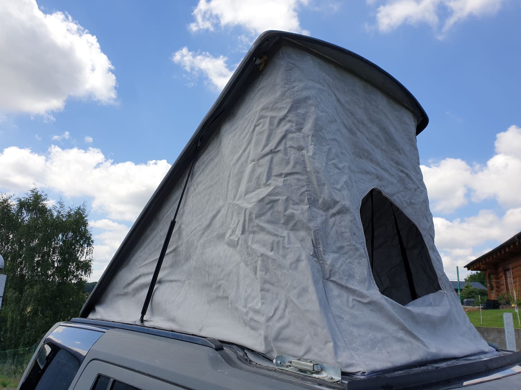 a pod ním je 2cm molitan, takže se tam dá spát i bez karimatky, vyzkoušeno. (Přemet Prkenapodlaha říká že "To se vyplatí!"). Plachta je natřená voskovým mlíkem co se používá na celty, proto vypadá trochu flekatě.