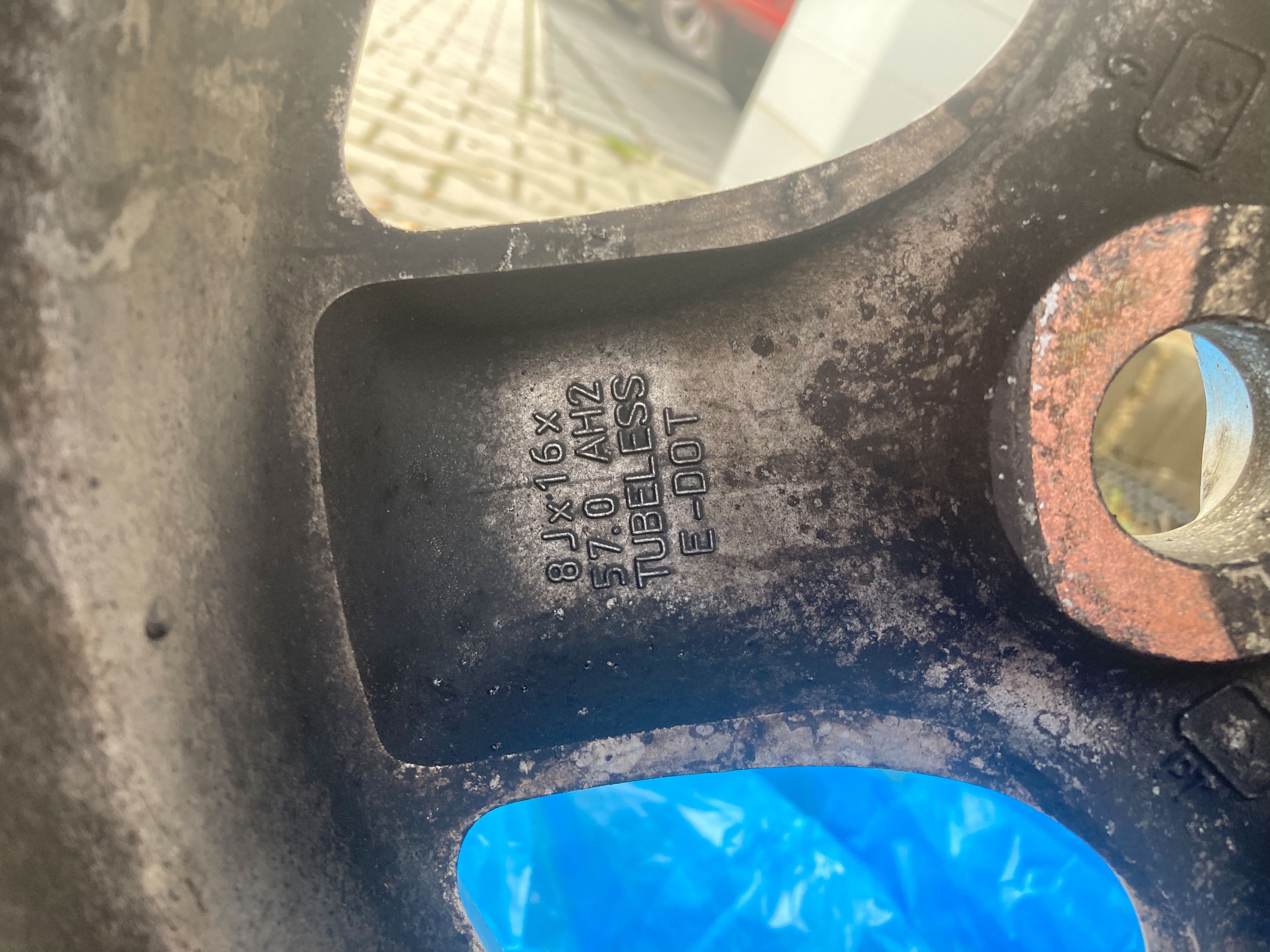 Disky 8J x 16, zvenku celkem pěkné, zevnitř mírně orvané od závaží, ale neucházejí. Na téhle sadě je z nějakého důvodu použito klasické závaží, ne to nalepovací, co mám na druhé...