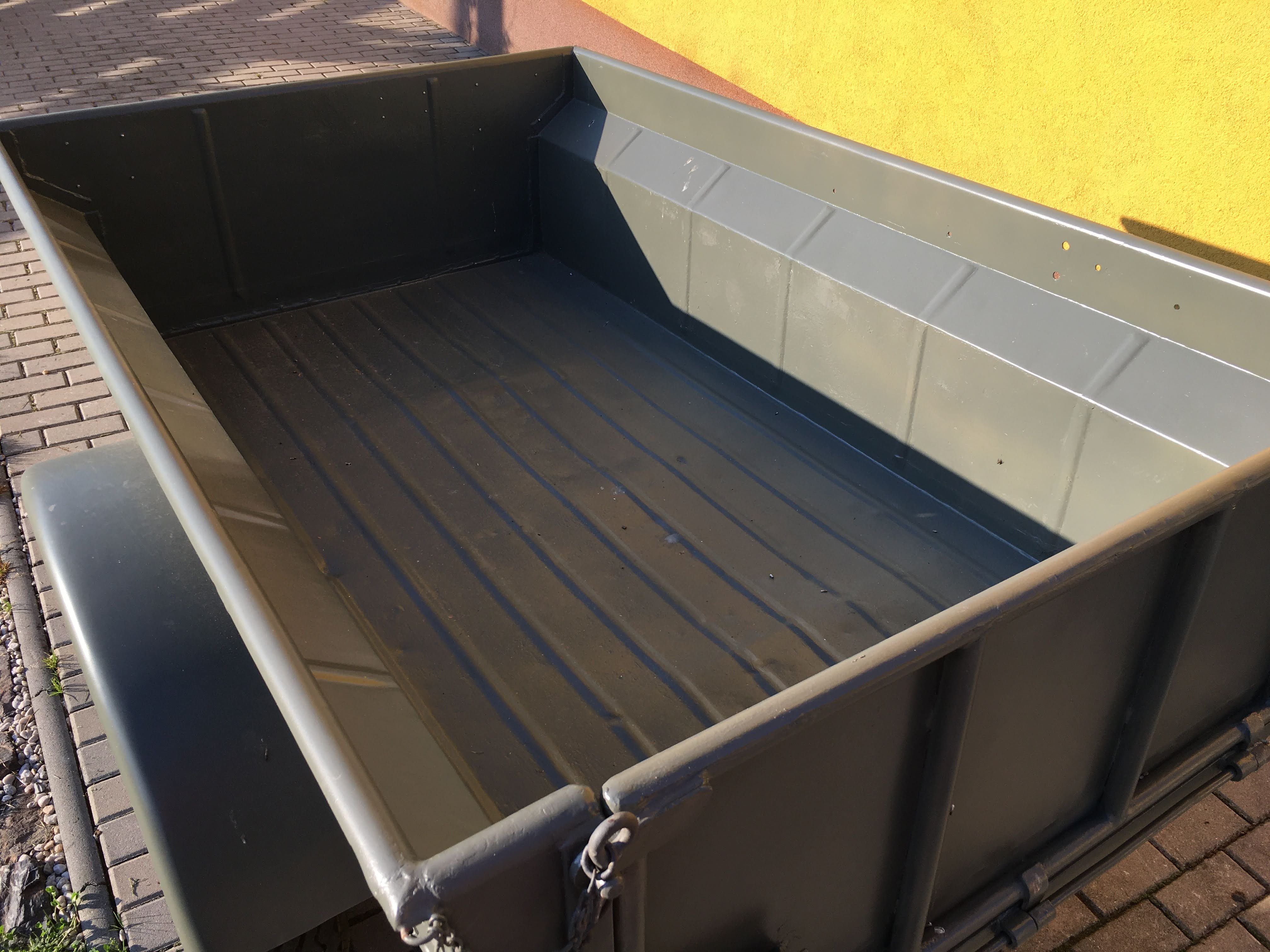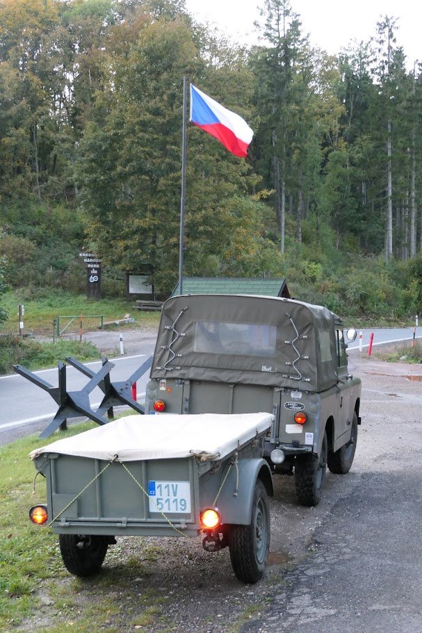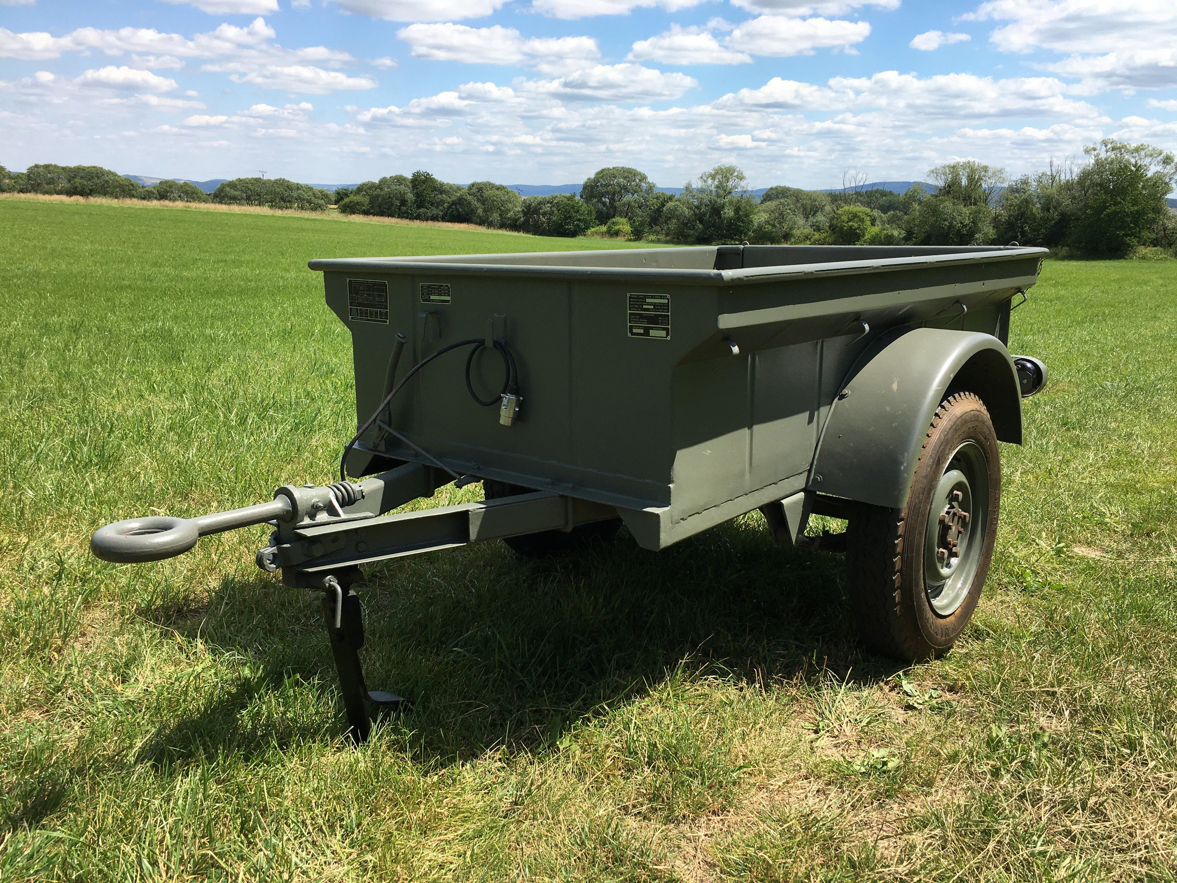 Prodám přívěsný vozík rozměrově shodný s válečnými přívěsy Jeep/Bantam, pravděpodobně poválečná výroba pro potřeby belgické armády (na rámu vyraženo číslo začínající "ABL...", tj. belgické ozbrojené síly). Otevírací zadní čelo, neoriginální světla (indická kopie lamp Hella), nová elektroinstalace, vyvařená vana, lak sice relativně nový, ale žádný zázrak. Na vozíku jsou LR disky na podložkách, které umožňují jejich montáž. Původní gumy 6.00x16 - už by zasloužily výměnu. Repro plachta české výroby od fy Autoplachty Nekvasil.
