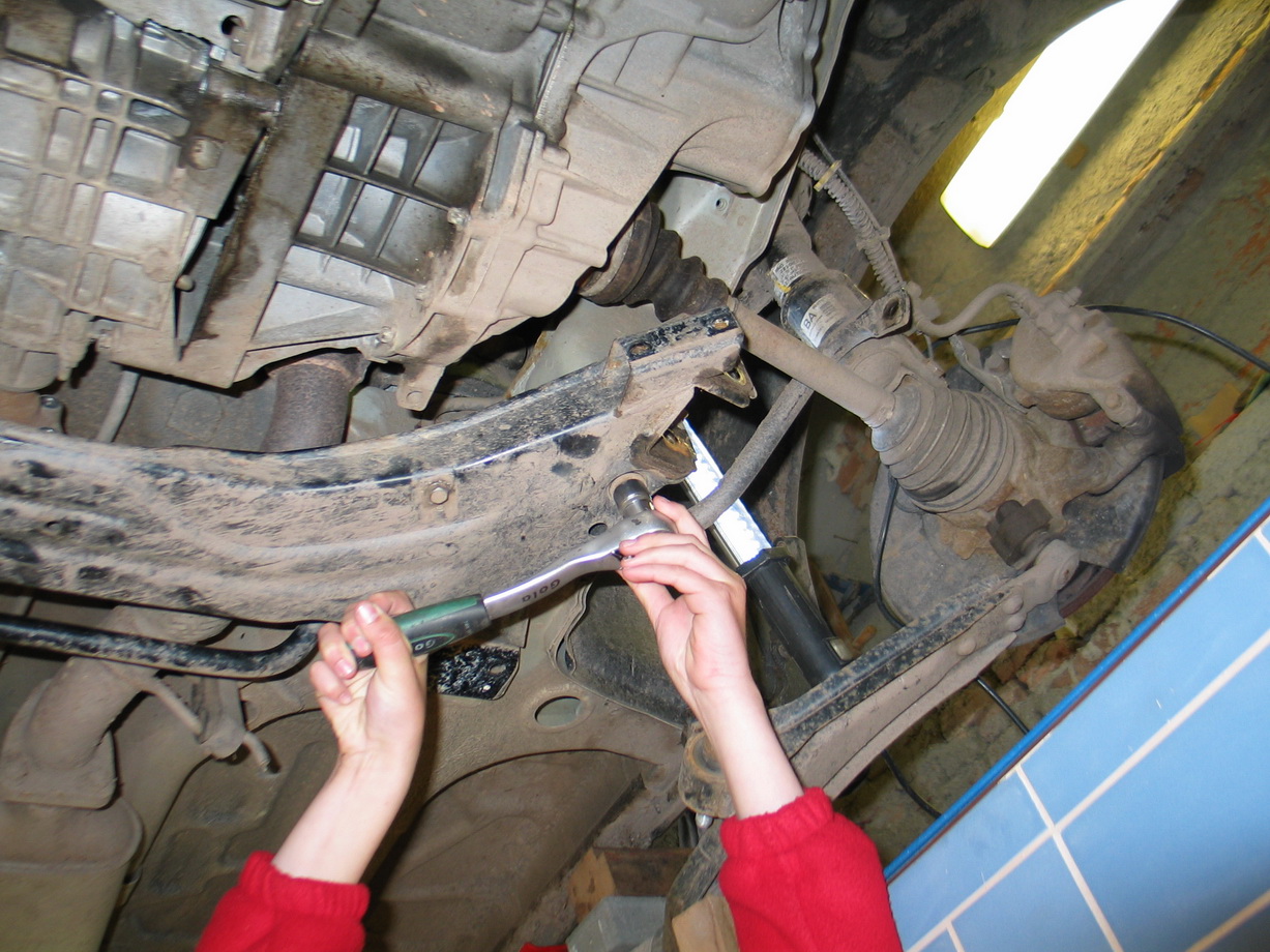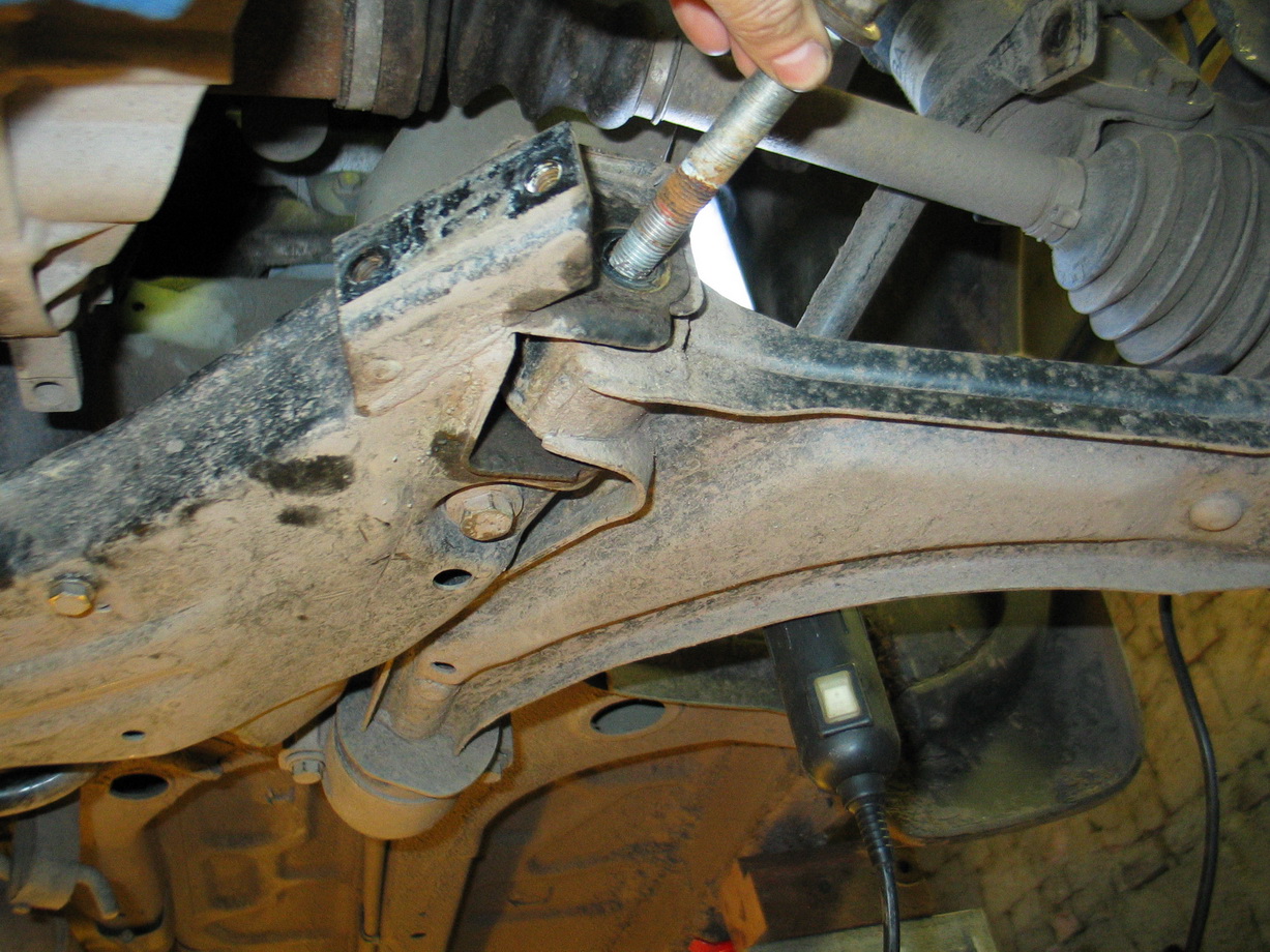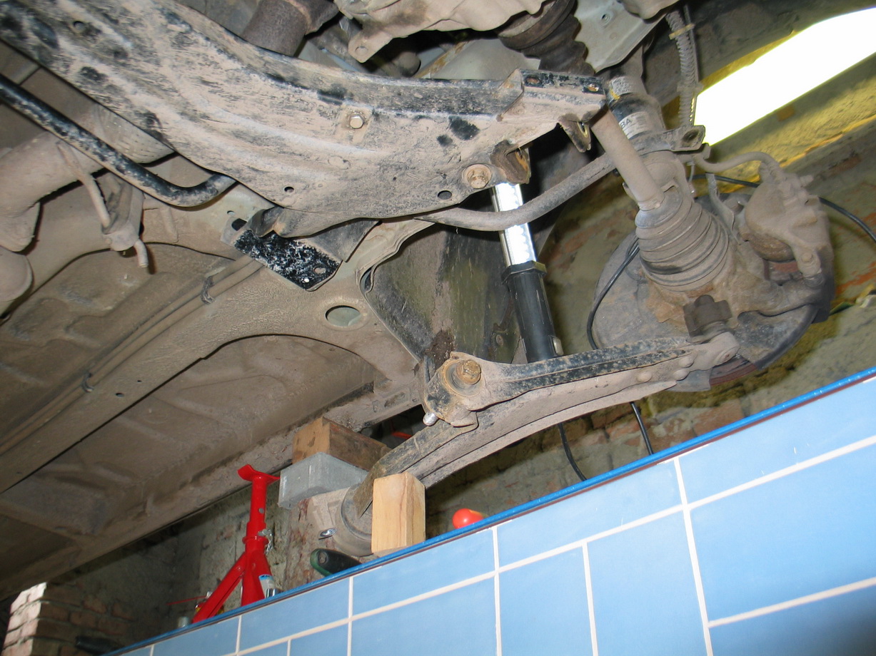 7.Odmontovat ramena zavěšení kol od nápravnice a karosérie (4šrouby domeček silenbloku v karosérii a dva vsilenbloku nápravnice)
