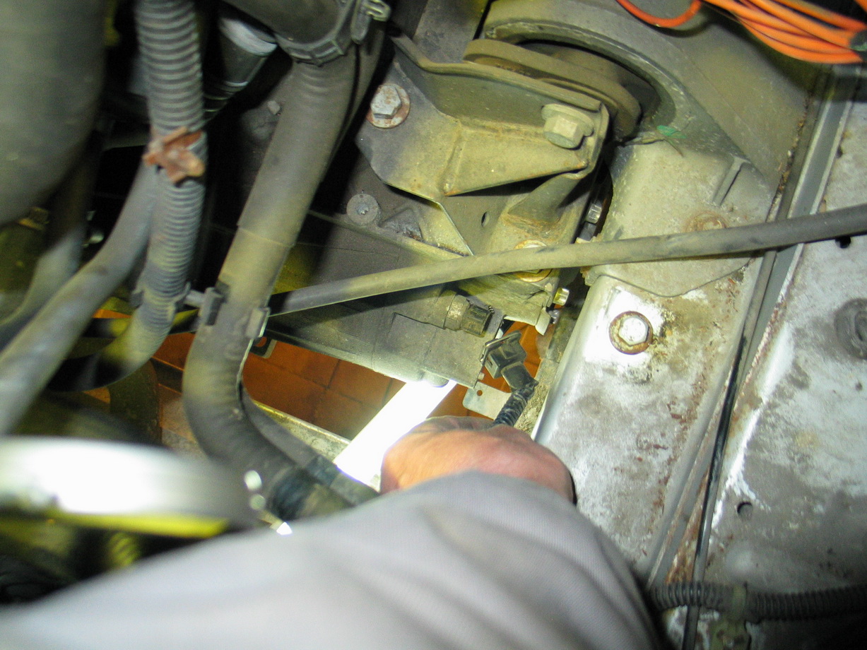 14.Odšroubovat 2 šrouby na zavěšení řadících táhel a celé zavěšení popustit dolů-jinak hrozí rozmačkání hadic chladící vody do IRD při naklánění motoru.