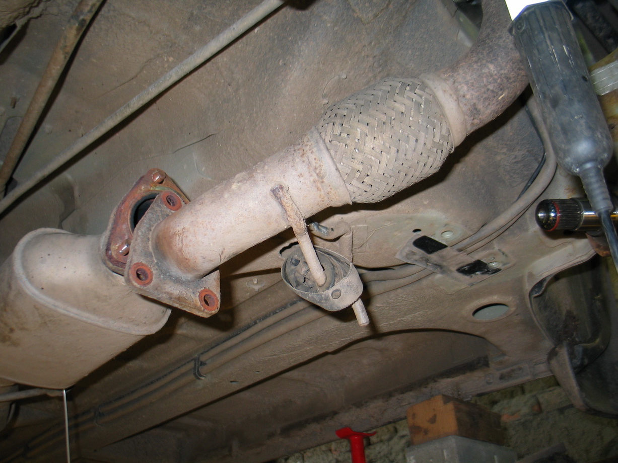 12.Rozpojit výfuk za pletencem (3.šrouby) a vytáhnout z prvního zavěšení