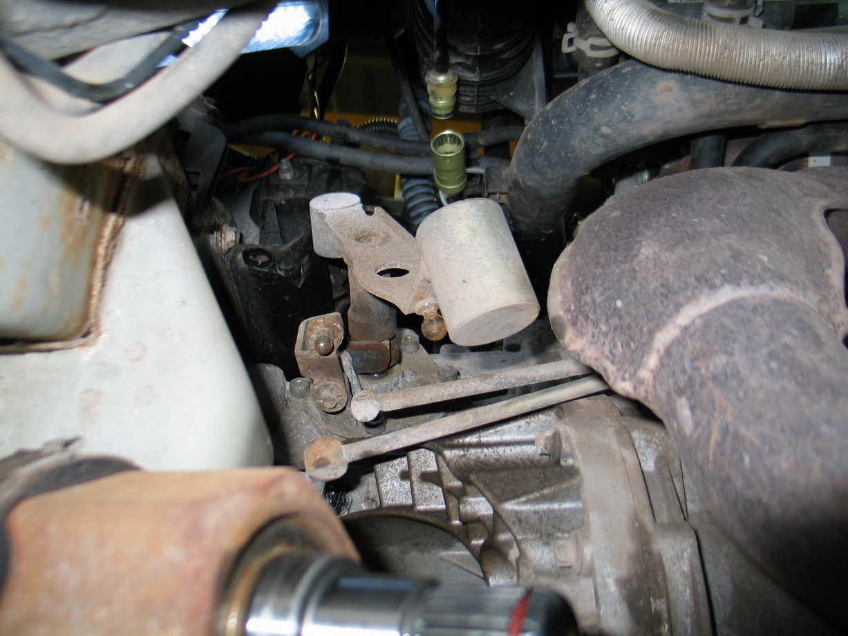 13.Sundat táhla z kulisy řazení na převodovce a vyndat celý dekl i s mechanismem řazení. Na boku převodovky je zajišťovací šroub. Nepokoušejte se vyklepnout pero....