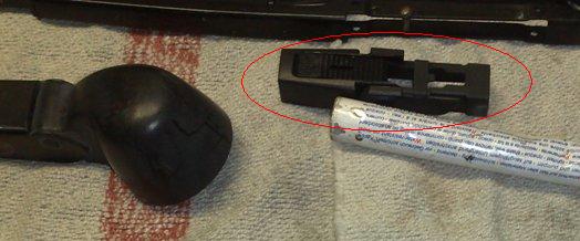 3. Oddělte starý stěrač i plastové „křídlo“ od ramínka na Discovery II (DII). Ramínko D II je zakončeno profilem „U“ ve kterém je díra cca 8 mm.