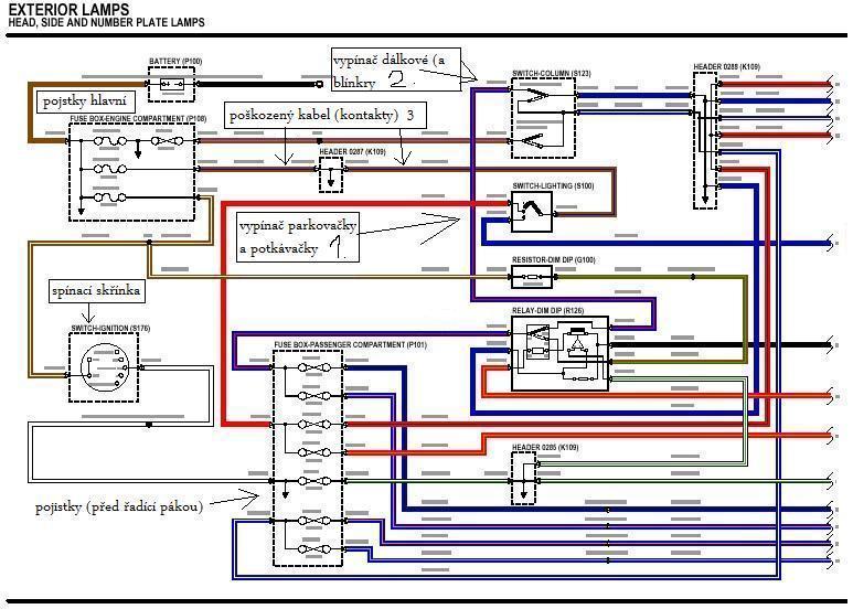 takový vánoční dárek:schema světel a popisek co sem vydedukoval v mém případě to byla varianta č.3 špatný kabel(kontakt u něj) nejsem elektrikář,ale strojař tak sem vzal zkoušečku a se znalostí že to má + a - začal ...(ted vím že i 12V svařuje)