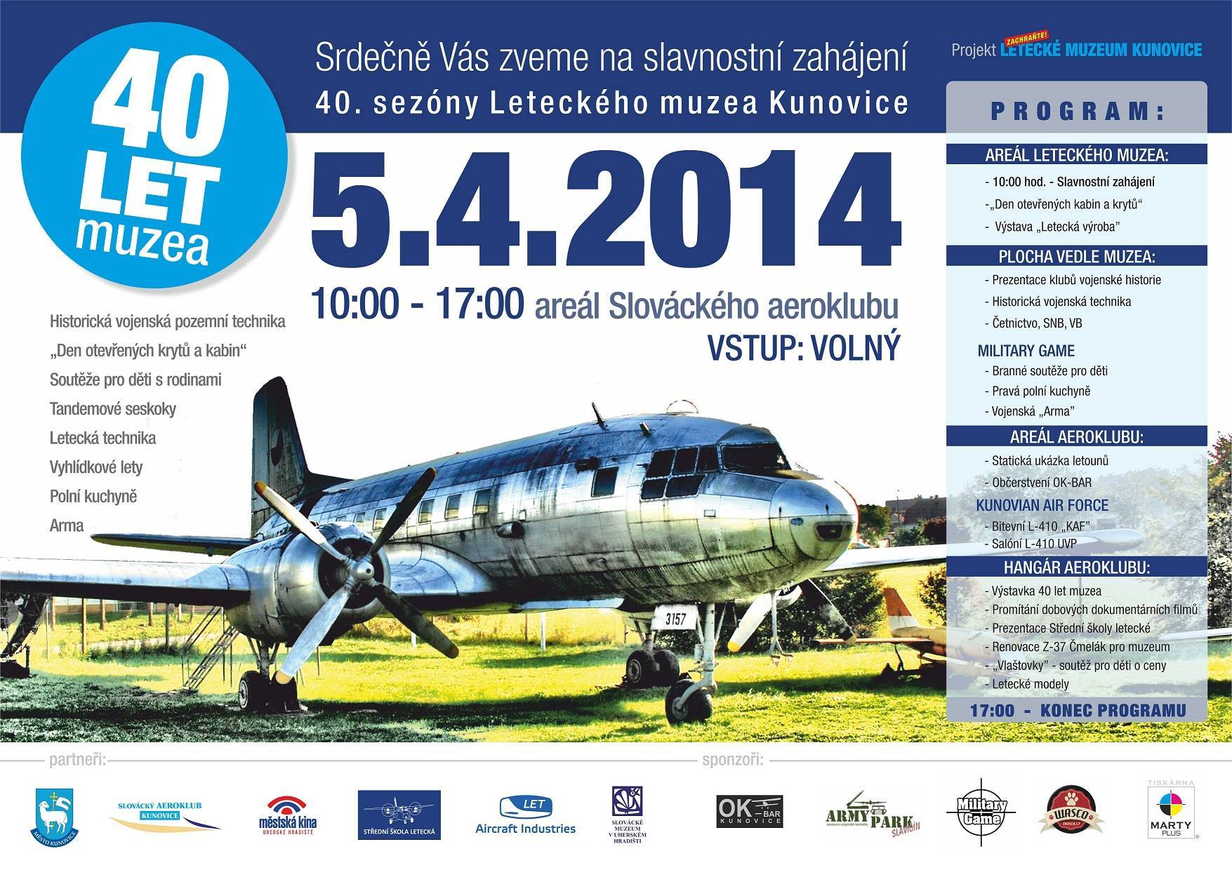 Chtěl bych Vás jeho jménem tedy pozvat na slavnostní zahájení 40. sezóny Leteckého muzea Kunovice. Akce se uskuteční 5.4.2014 v době od 10:00 – 17:00