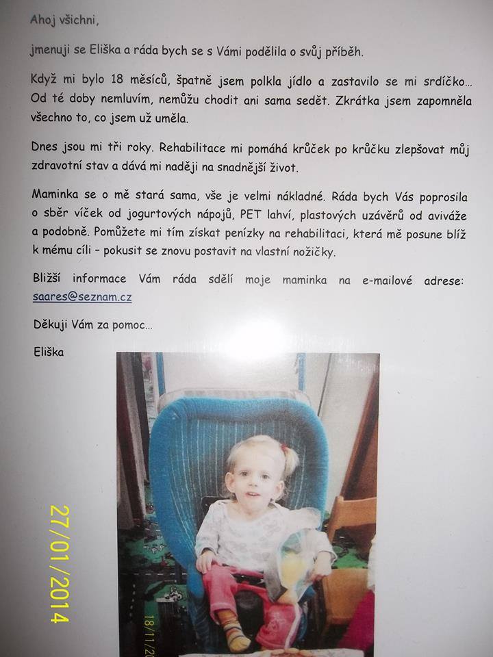 11.2.2014 byl vytvořen transparentní účet pro Elišku, která potřebuje Vaši pomoc. Kdokoliv může nahlédnout na sumu, která je na účtu a jak se s penězi hospodaří Vás budeme průběžně informovat. Informovat o vybrané částce Vás také budeme denně na stránkách. Pokud budete chtít přispět třeba i částkou 5,- Kč. budeme za Elišku moc rádi. Fio Banka Pokud budete chtít nahlédnout na účet , tak můžete kdykoliv tady https://www.fio.cz/scgi-bin/hermes/dz-t ... 2100543917 (SEM JIZ NEPRISPIVAT).Další informace podáme na emailu saares@seznam.cz