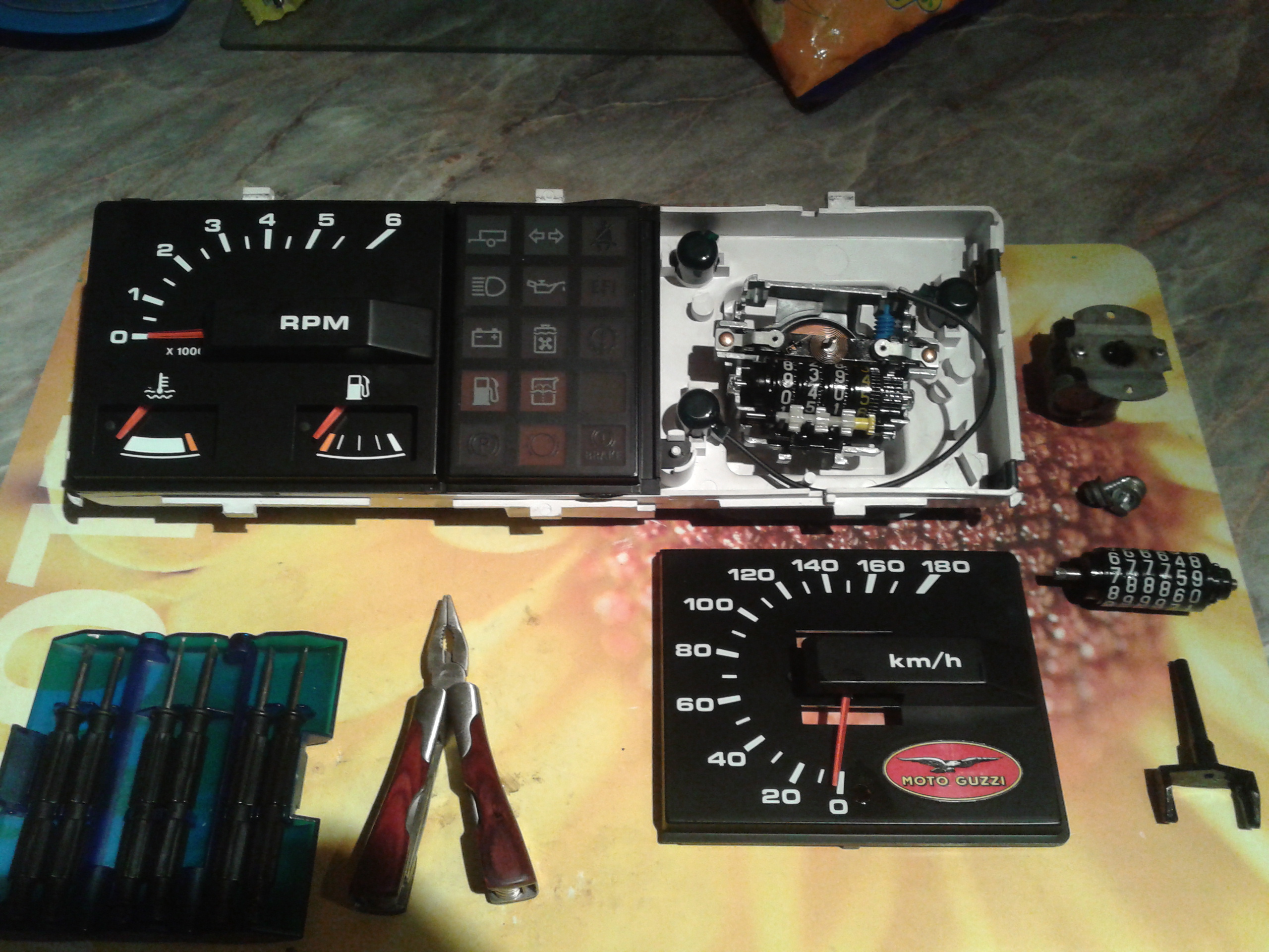 Úplně by mi stačil jen funkční pravý díl - tachometr. Nebo třeba jen mechanismus počítadla kilometrů. Na tom mém sice tachometr funguje ale počítadlo ujetých kilometrů nepočítá. Myslel jsem že bude jen zaseklé ale bohužel to asi neopravím. Jedno plastové kolečko pro převod od nulovacího počítadla k hlavnímu je trochu oholené a jeho uložení už je tak vytahané že tam skoro nedrží. Samotný číselník vyčistit a promazat teflonem můžu ale s tím vyčvachtaným plastovým uložením nic neudělám.