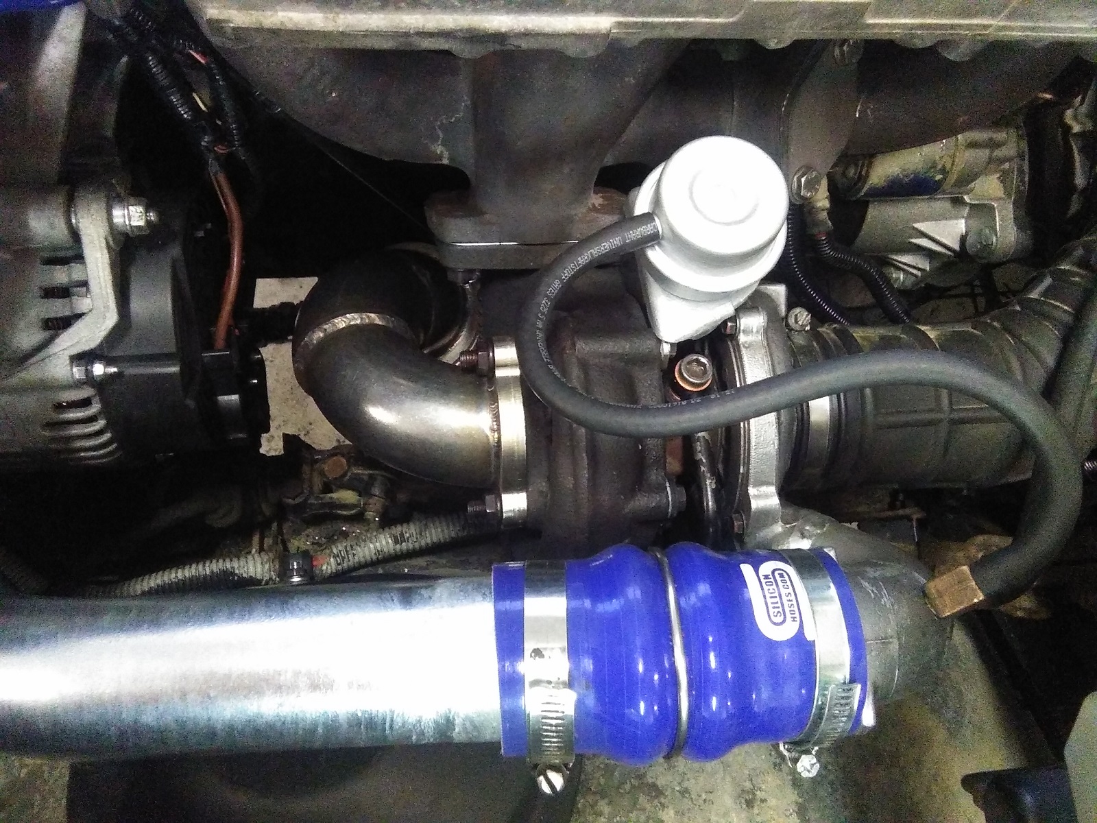 Čus. Je to ovládané přetlakem. Podtlakový ventil z BMW je vyměněn za přetlakový z 300Tdi, který byl na původním turbu. Ta odbočka na hadičce vede do kabiny k tlakovému budíku. Ještě to chce pořádně naladit předstřik a dávku paliva a pojede to ještě o trochu líp. I takhle to ale jede fakt pěkně