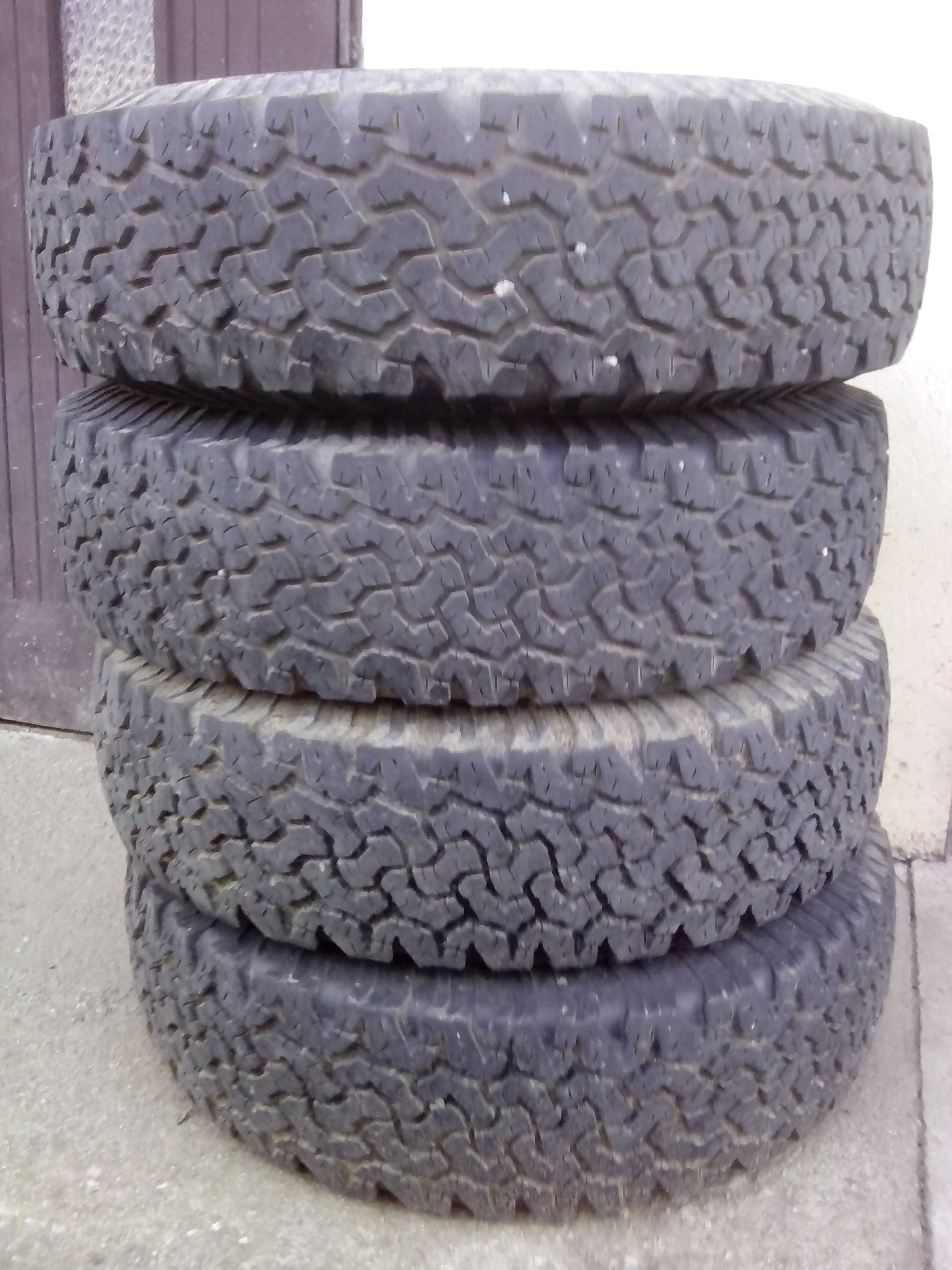 Čaute, mám na predaj pneumatiky BF Goodrich 235/85 R16. Sú v perfektnom stave, majú ešte hĺbku dezénu 8mm. Mal som ich obuté na mojom Discovery2, ale mne boli veľké, tak som si kúpil menšie. Predávam ich ako sadu, nie po kuse. Cena 200 euro. Som zo Slovenska, okres Lučenec.