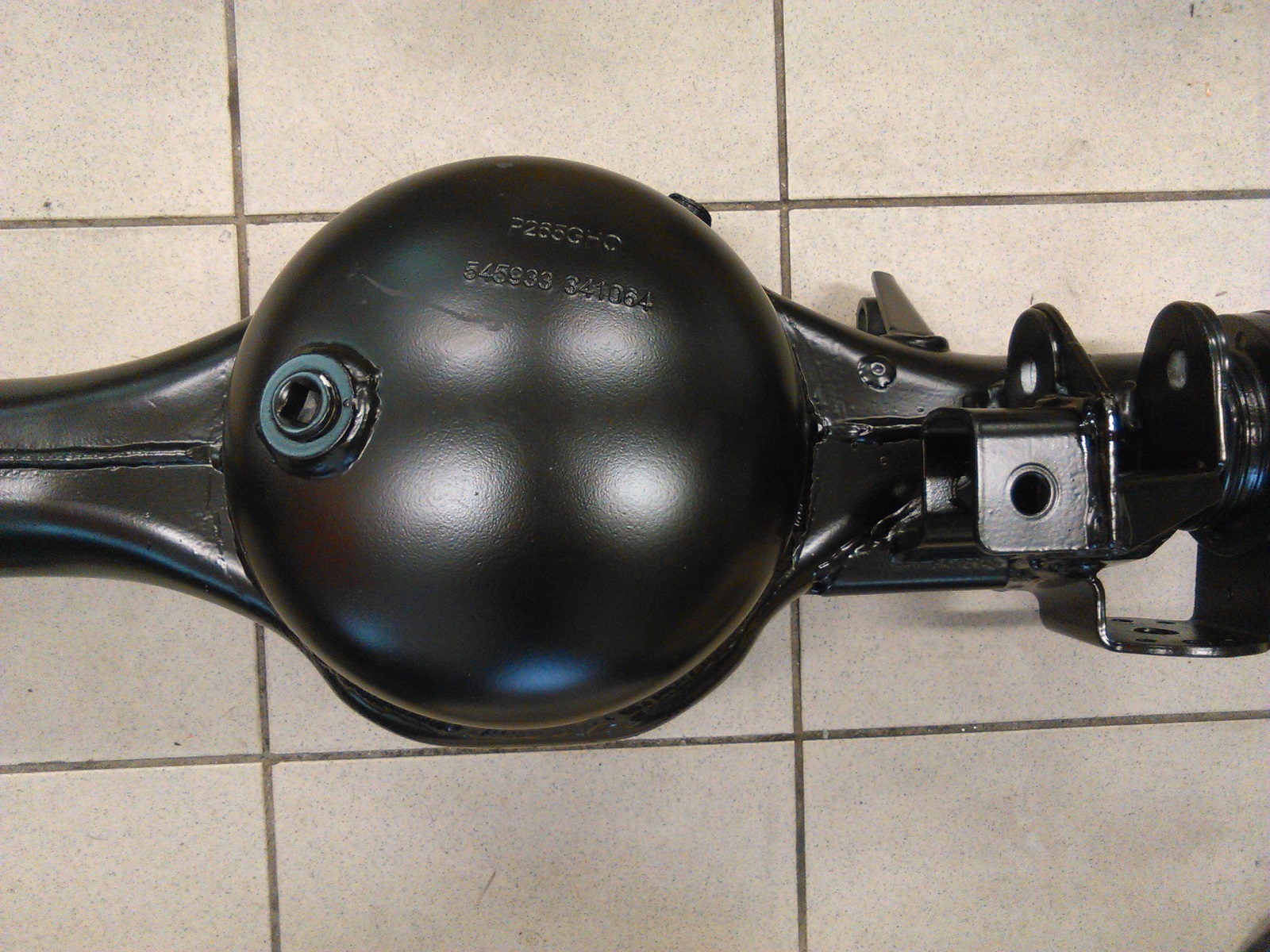 Náprava je opískovaná, nastříkaná epoxydovým základem a polyurethanovou černou. Místo plechového víka je navařené upravené dno tlakové nádoby, síla stěny 6mm. Náprava je pískovaná zaslepená, takže dovnitř nemůže vniknou písek.