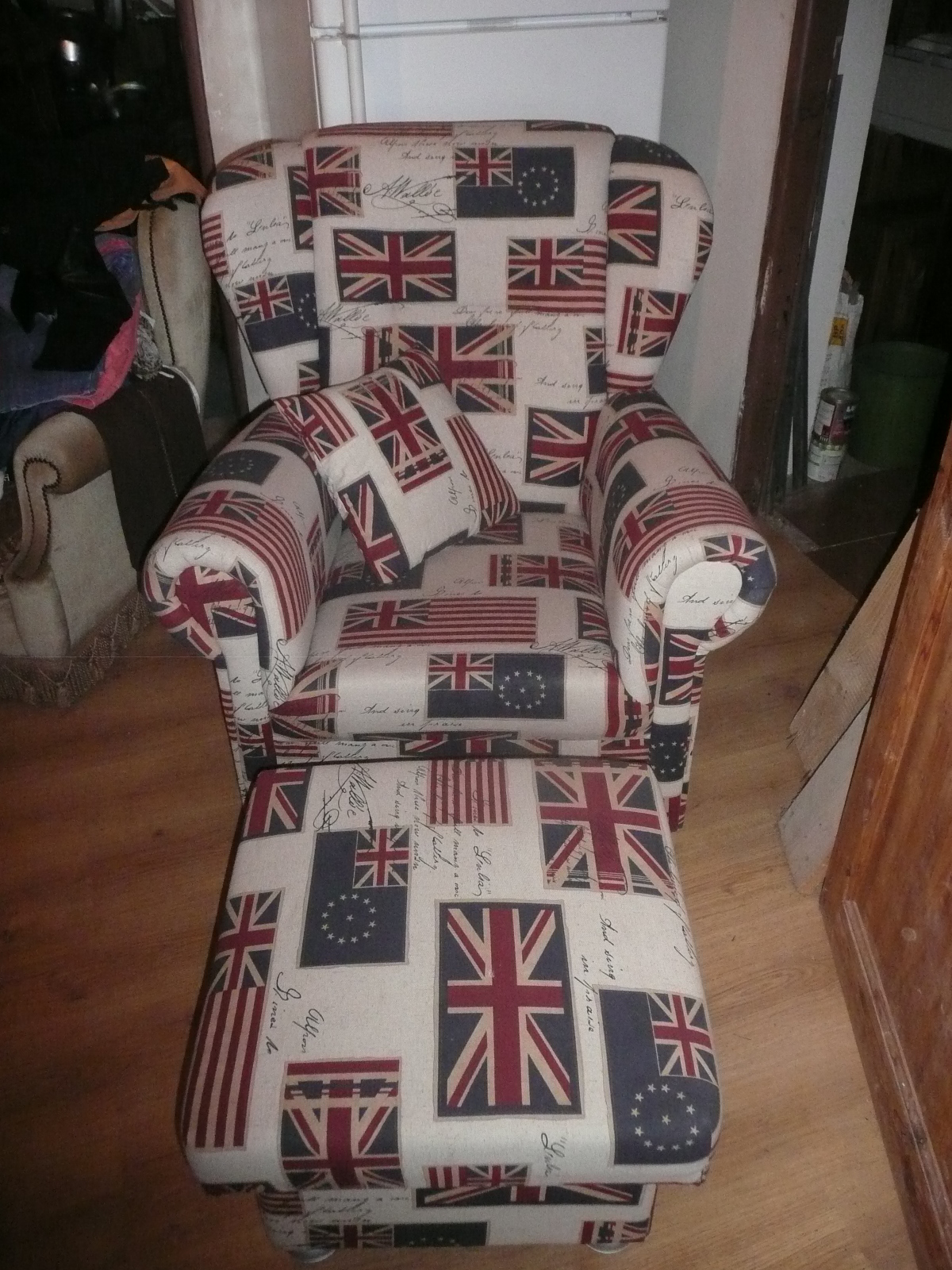 Křeslo a taburet, anglický motiv, zánovní stav. Cena 3900 kč.