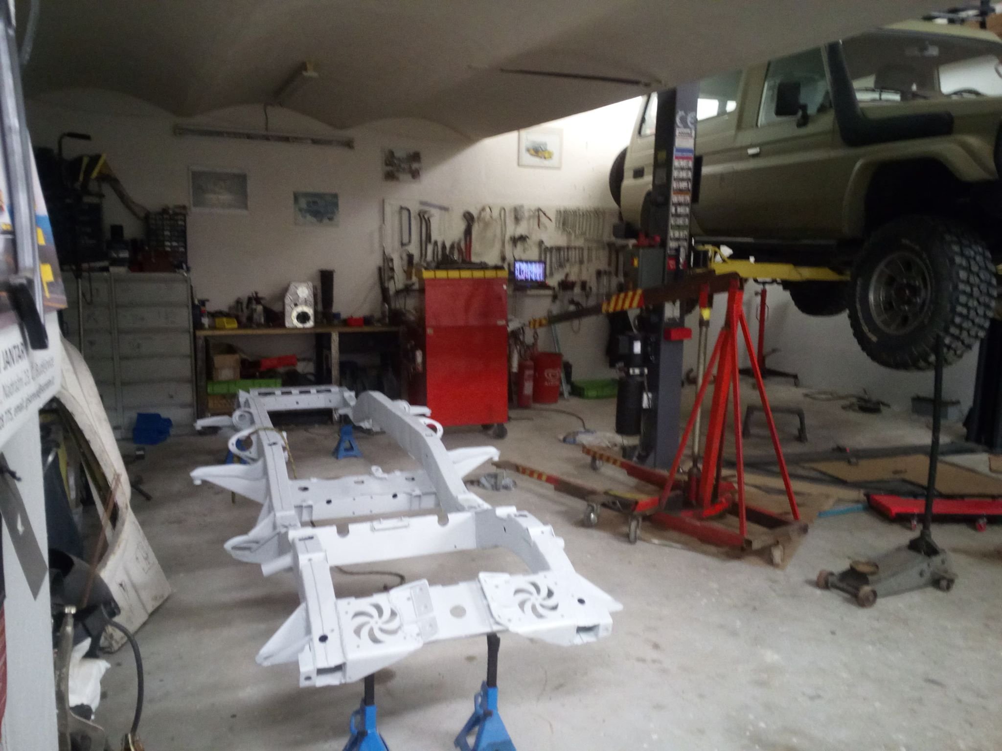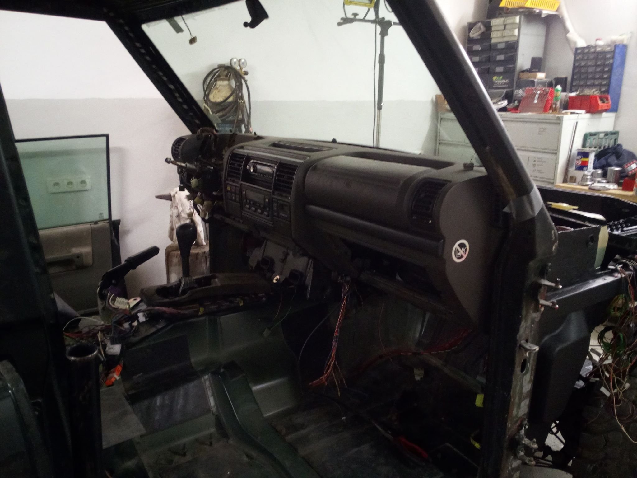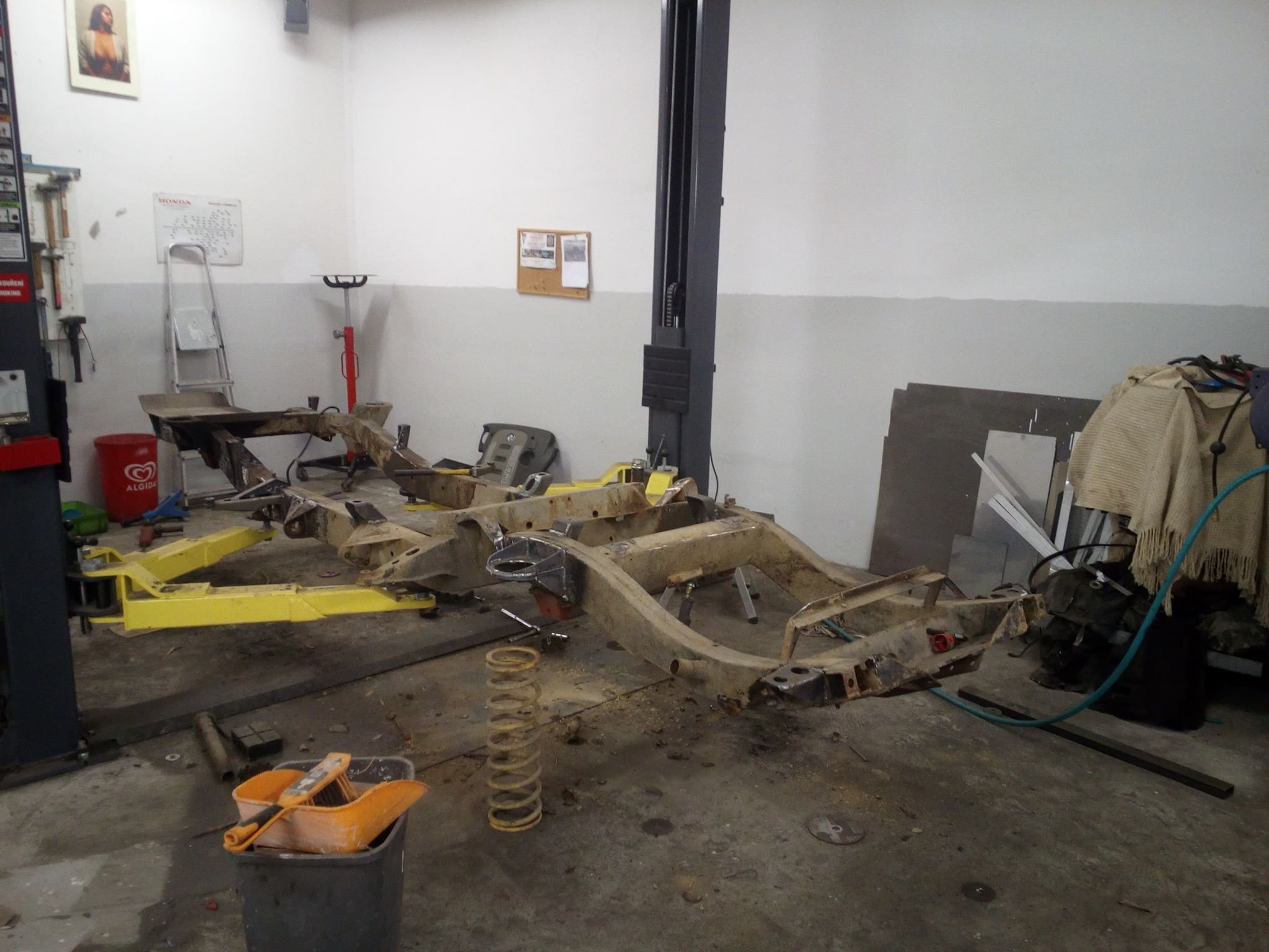 Sice jsem sem nic nepsal, ale stale pracuji. Po dokonceni blatniku jsem udelal motorovy prostor, pustil jsem se i do elektriky, bude tam z D2 ale ocesal jsem ji o veci ktere nepotrebuji jako ABS el. prevodovka , motor Td5 a tak. Pak uz jsem musel zacit davat dohromadi interier jak z psychického hlediska aby se uz neco pohlo tak uz jsem nemel kam vse davat. No a aby to uz zacalo dvat smysl musim zacit odspodu takze jsem se pustil i do ramu, prevarit drzaky kastle , zadnich pruzin i predni napravy, nechat opiskovat pozinkovat a vcera a dnes strikat, nejhorsi byli pruziny to se dilna promeniula na repkove pole a byla cela zluta.