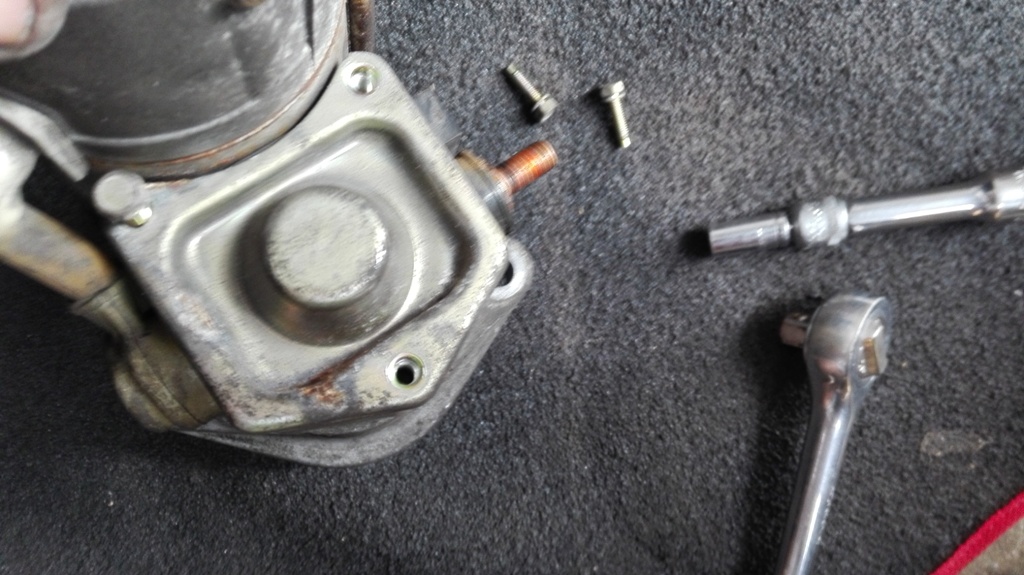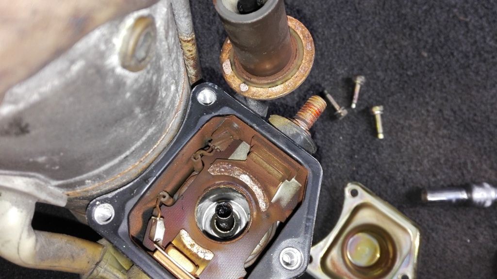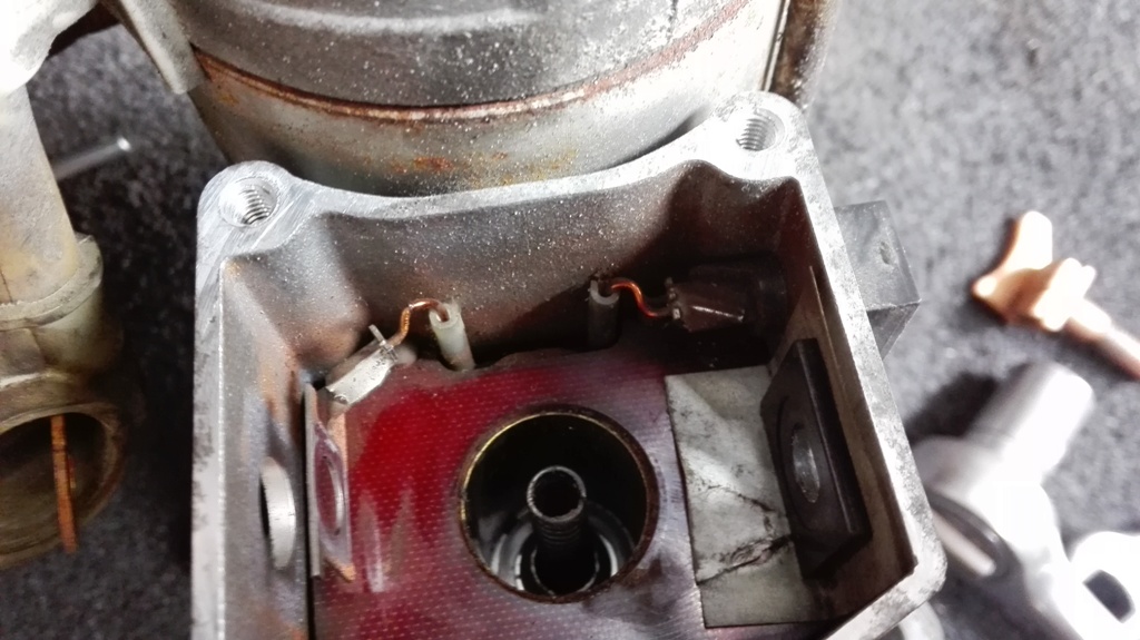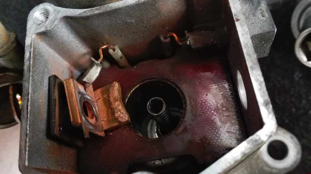 3. Ze startéru odšroubujeme krytku solenoidu, poté vyjmeme samotný solenoid a kontakty. Kontakty je dobré si přidržet zevnitř odpovídajícím klíčem, ať toho moc nezryjí. Největší pozor jsem dával ale na měděné drátky, které jsou vedle. Fakt by se mi nechtělo je spravovat. Těsnění a podložky jsem si také raději vyskládal tak, jak jsem je demontoval, abych nezapomněl jak to vrátit zpátky. Ale vše je jednoduché a intuitivní.