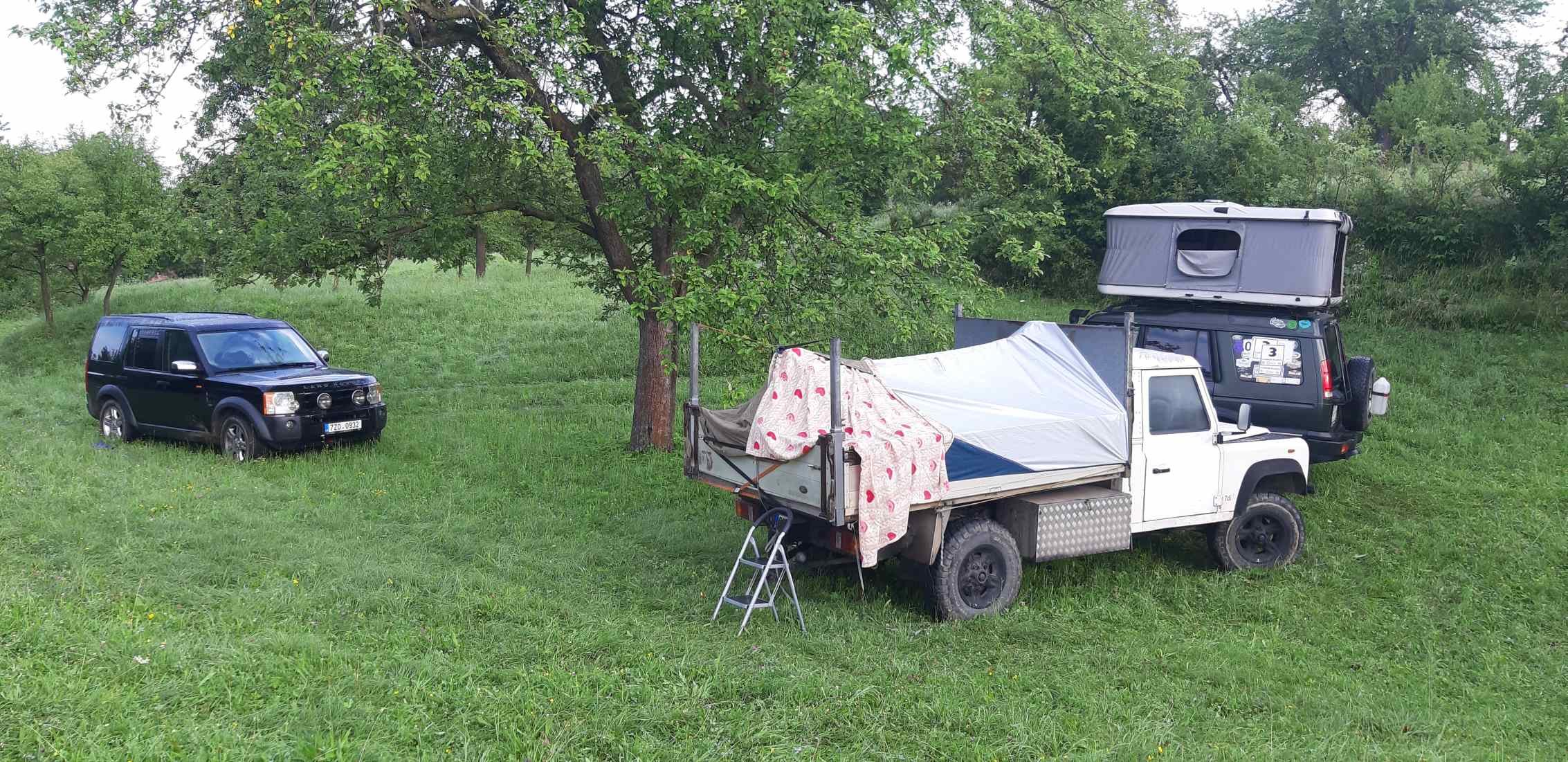 Po ránu. Všimněte si klasické "střešního" stanu na Defenderu, doladěného dekou a s hydraulickým vyrovnání terénu. Lepší než Xlifter.