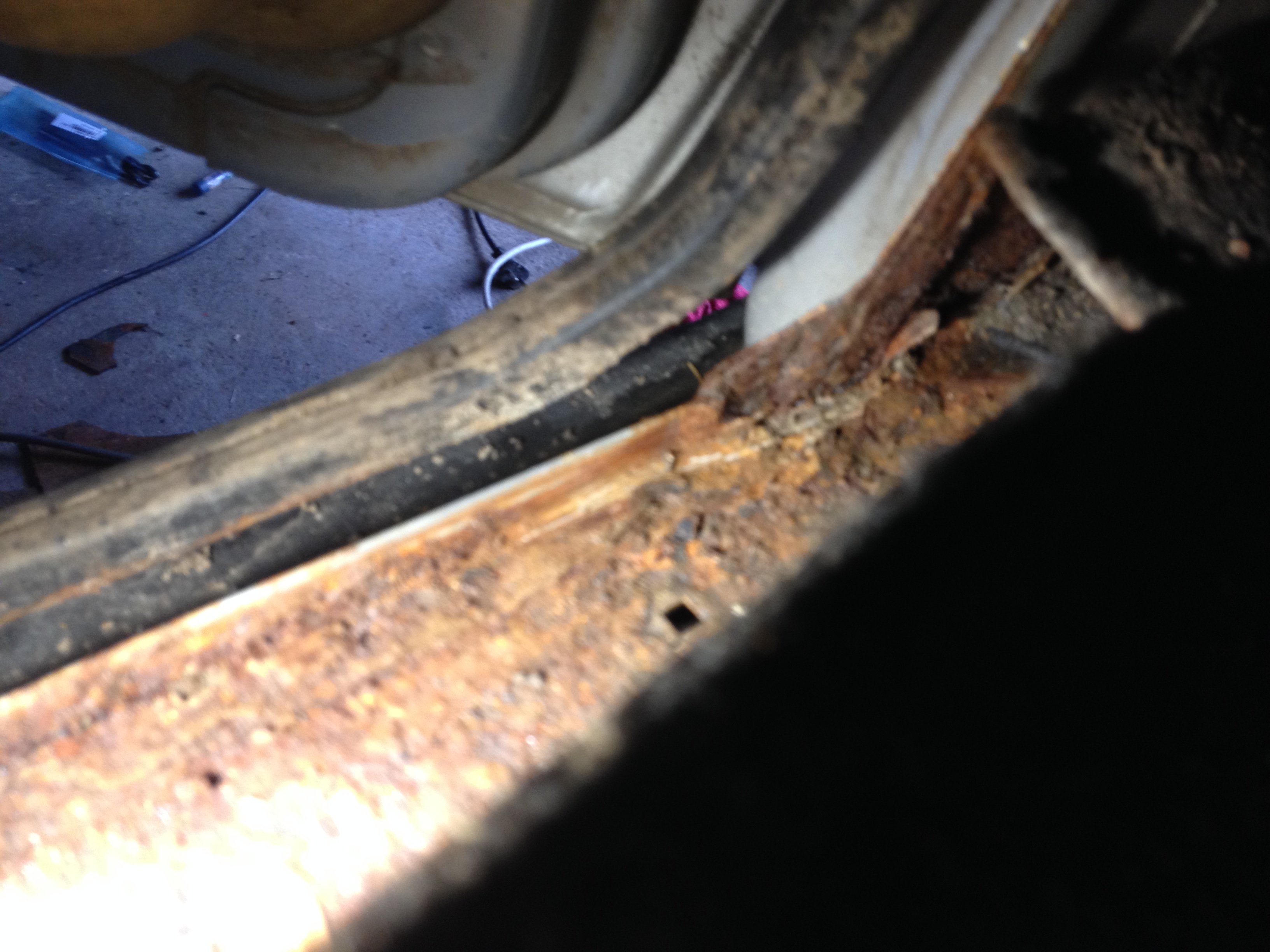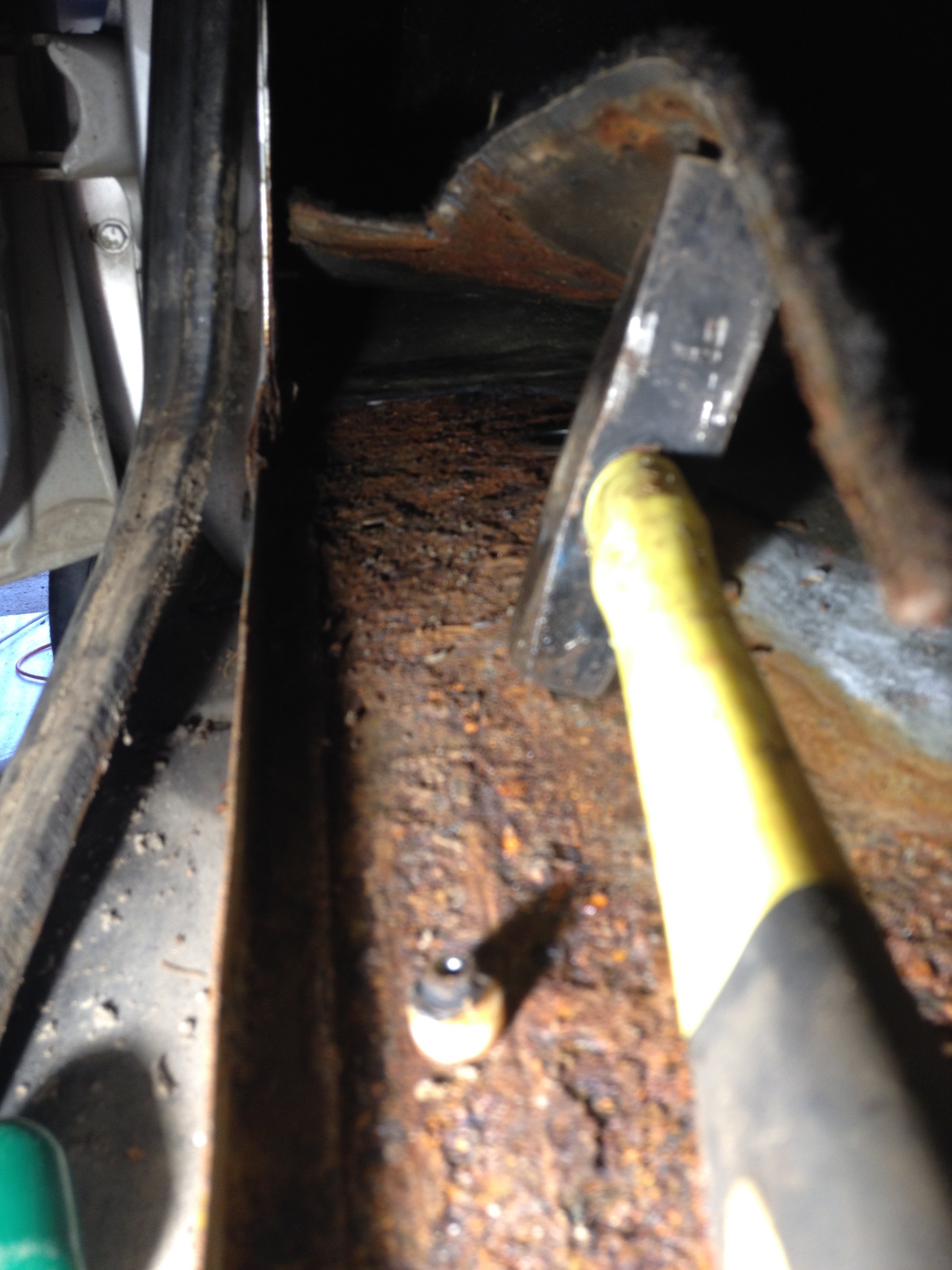 A aby toho nebylo málo, tak jsem tedy sundal tu lištu u řidičskejch dveří a kouknul pod koberec, viz foto - žádná sláva :S .