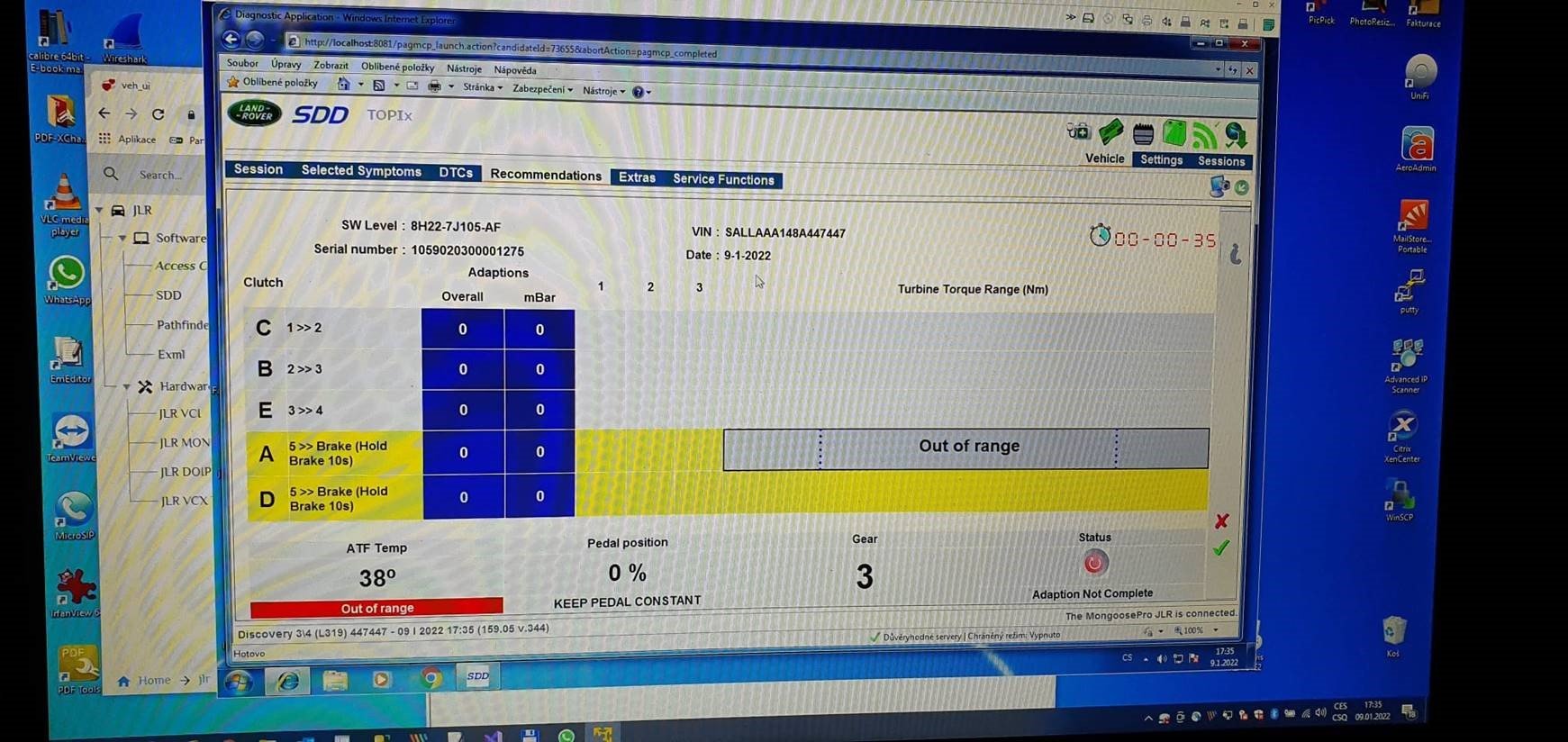 Po spuštění SDD a založení session, mi to nalezlo jednotku TCU, kde mi bylo nabídnuto přehrát sw a taky mi to dále nabízelo(doporučilo) adaptaci. Tak jsem tím procesem prošel, sw se updatoval a nyní to vypadá, že už tu jednotku zná a vypíše korektně typ (8H22-7J104-AC a 8H22-7J105-AF), což před tím nebylo a následně doporučuje adaptaci, ale tu nemohu provést, protože na D3 svítí stále F a jde zařadit jen 3ku, tzn. nejde udělat proces postupného zařazení rychlostí jak je tam popsáno. Nová převodovka je z Range Rovera r.v. 2006.