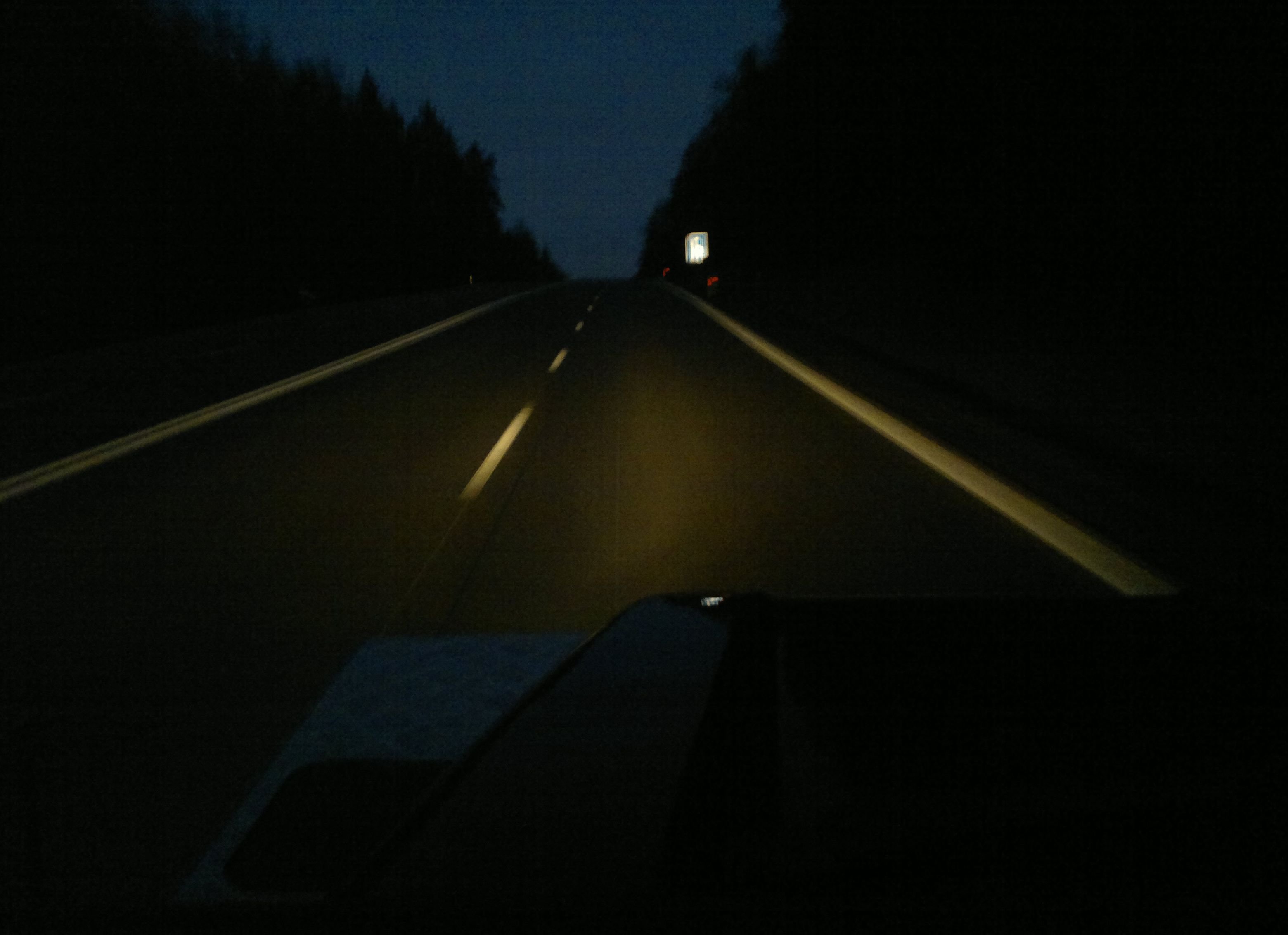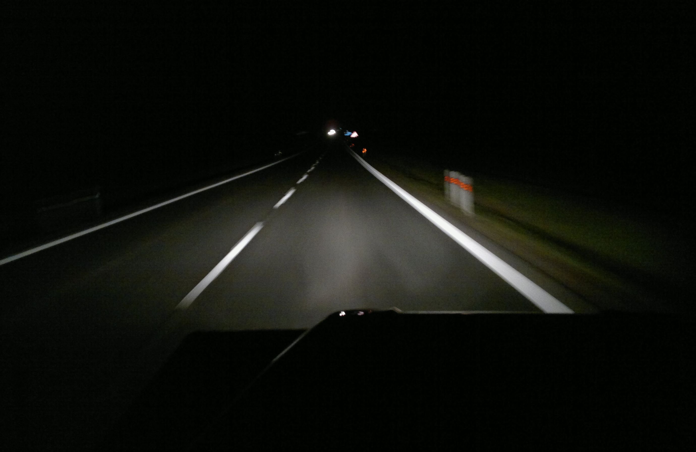 Pro zajímavost - Takhle to občas vypadalo s původními žárovkami, když za mnou jel nějaký závodník z čeledi buzíčkovitých, co se mi lepil na zadek. Nasvícení bylo o poznání lepší i díky světlé výšce Defíka. Ideální bylo, když ještě netrpělivě rajtoval z leva doprava, to jsem měl opravdu krásně nasvícenou scenérii