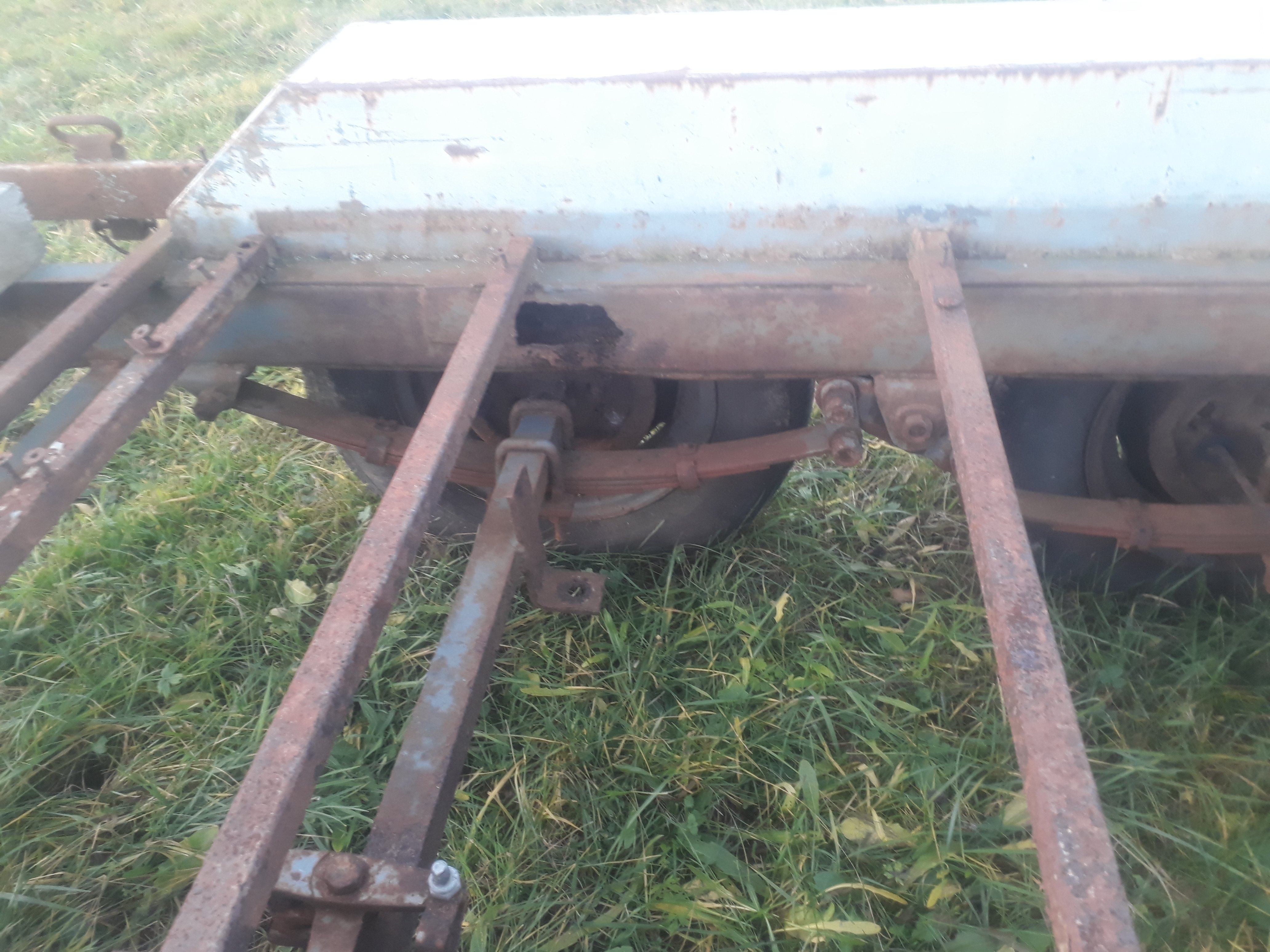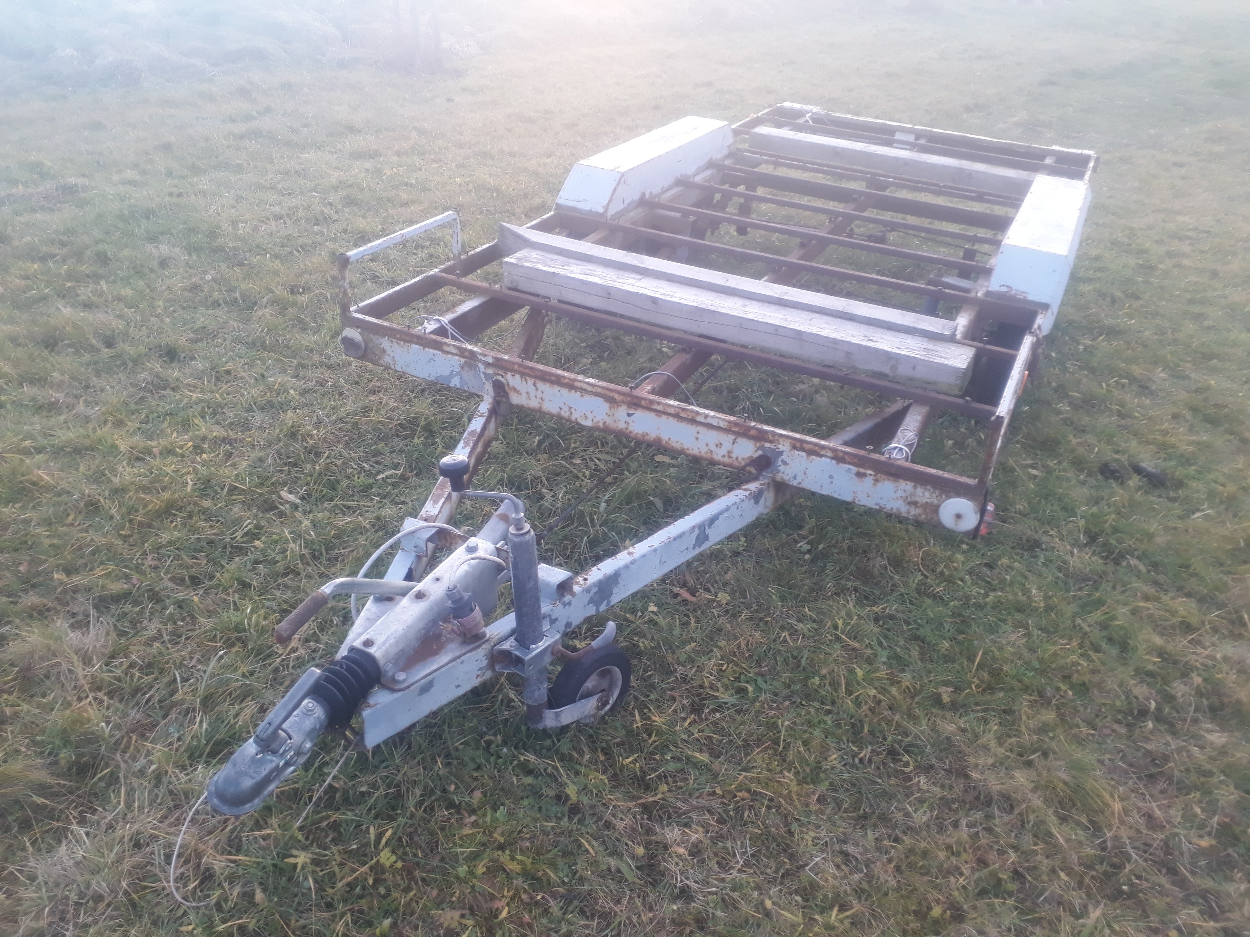 Původní anglický Peak trailer s doklady psanými na mne, evidenčku udělá, technickou ne. Je na několika místech prorezlý skrz, brzdy fungují tak nějak bezzáruky, elektro fungovalo snad na sto procent, no spíš na 90 - osvětlení spz asi nejde. Má to lisťáky s tou společnou protichůdnou houpačkou