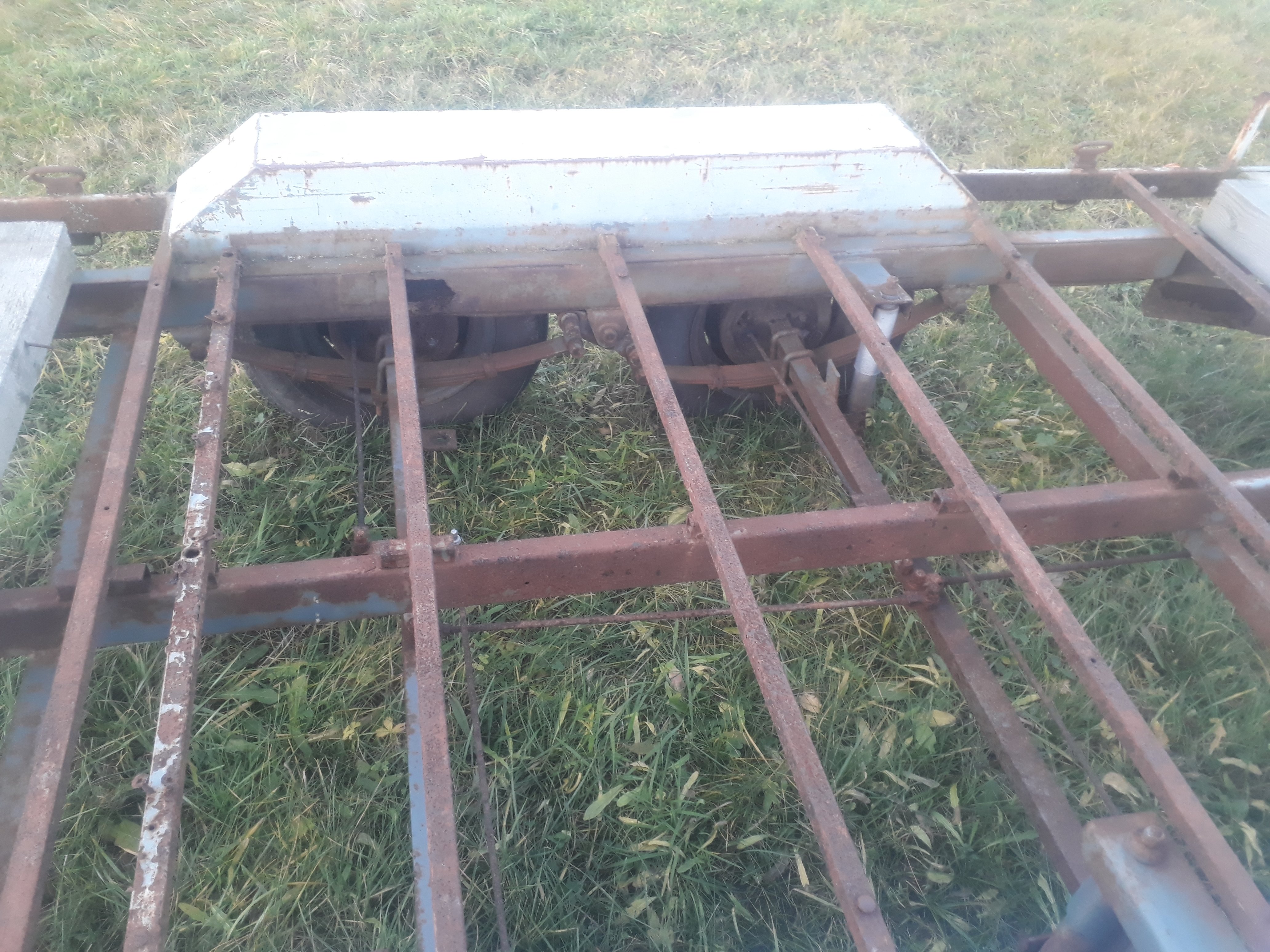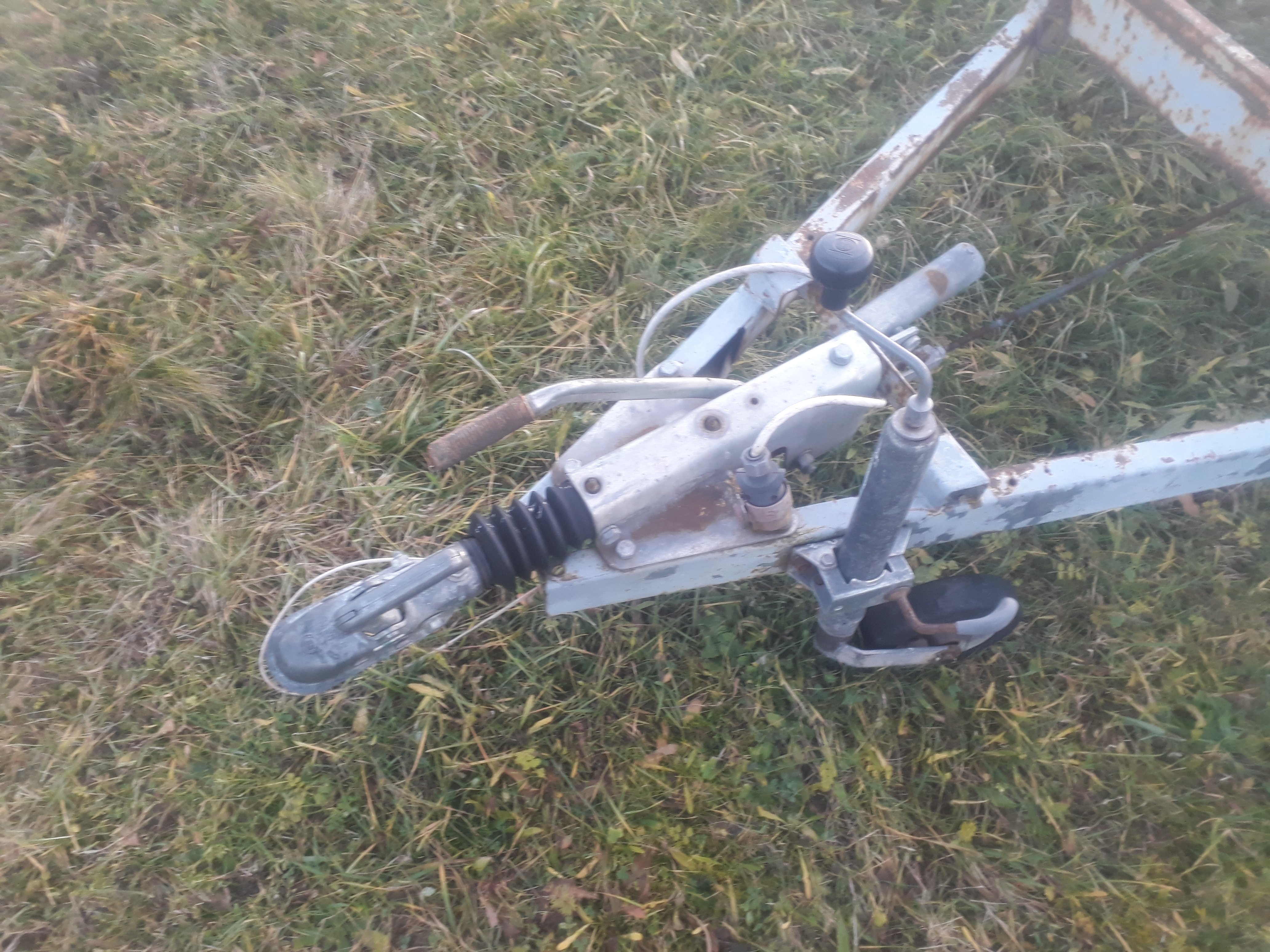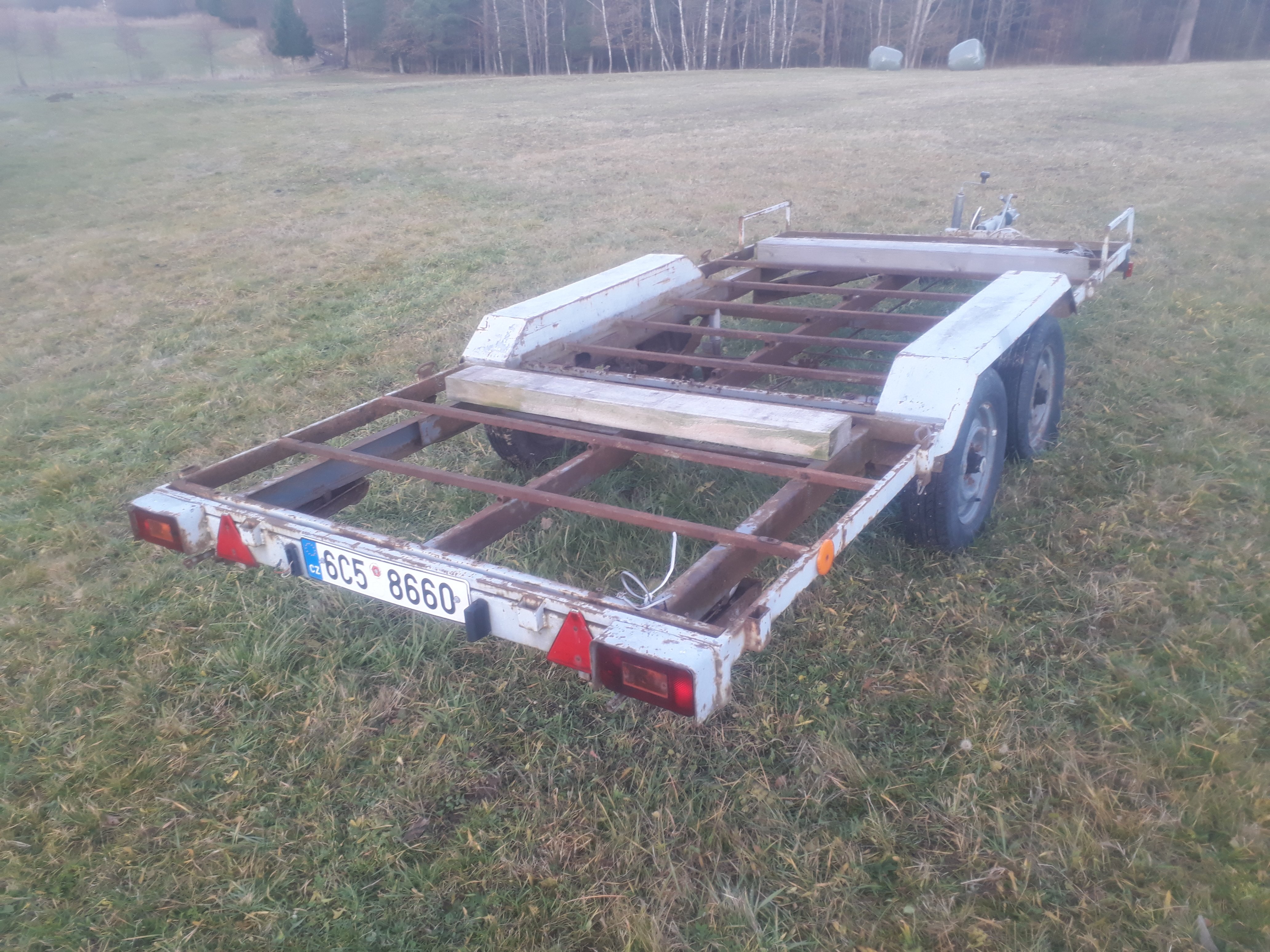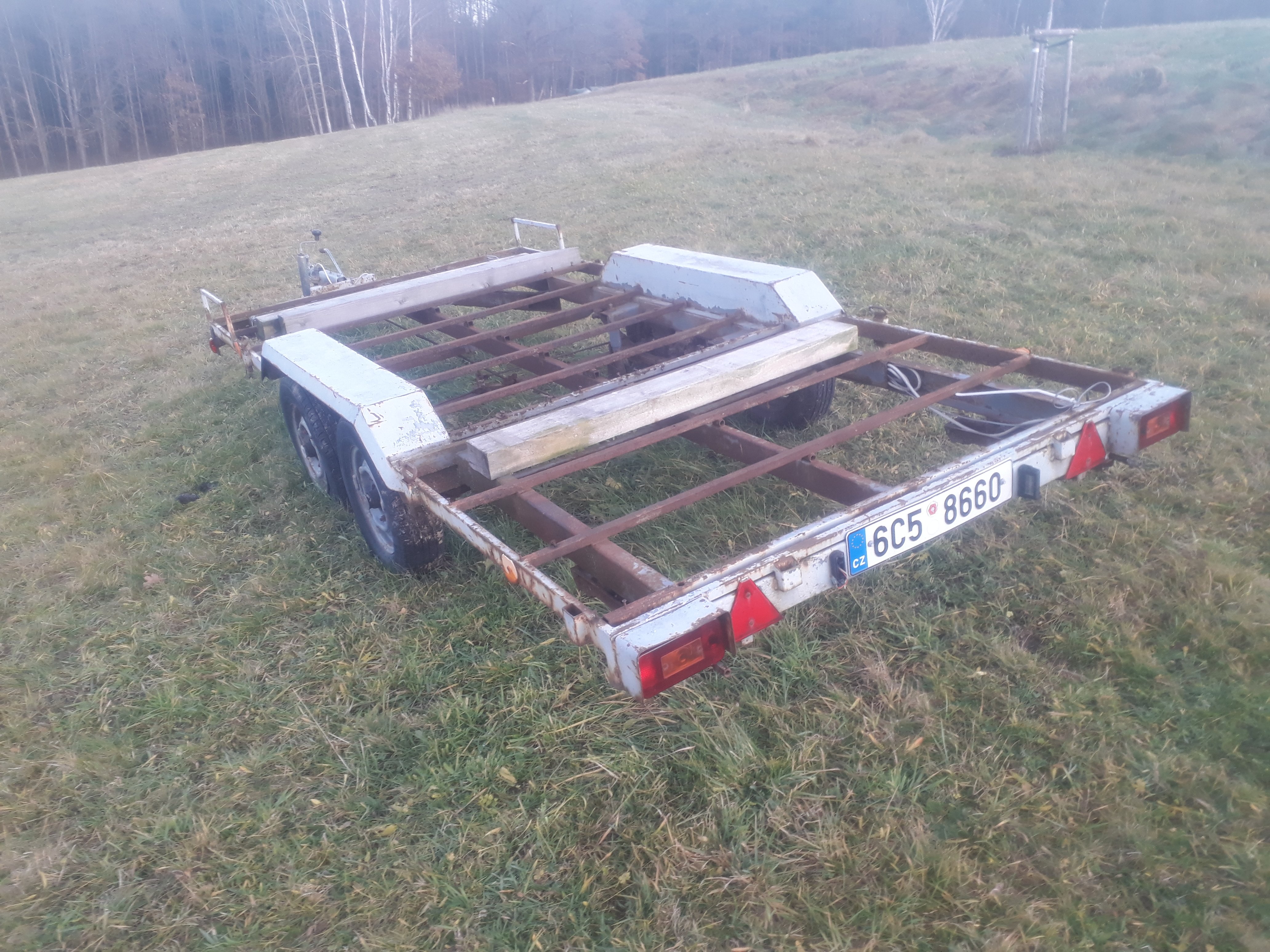 Původní anglický Peak trailer s doklady psanými na mne, evidenčku udělá, technickou ne. Je na několika místech prorezlý skrz, brzdy fungují tak nějak bezzáruky, elektro fungovalo snad na sto procent, no spíš na 90 - osvětlení spz asi nejde. Má to lisťáky s tou společnou protichůdnou houpačkou