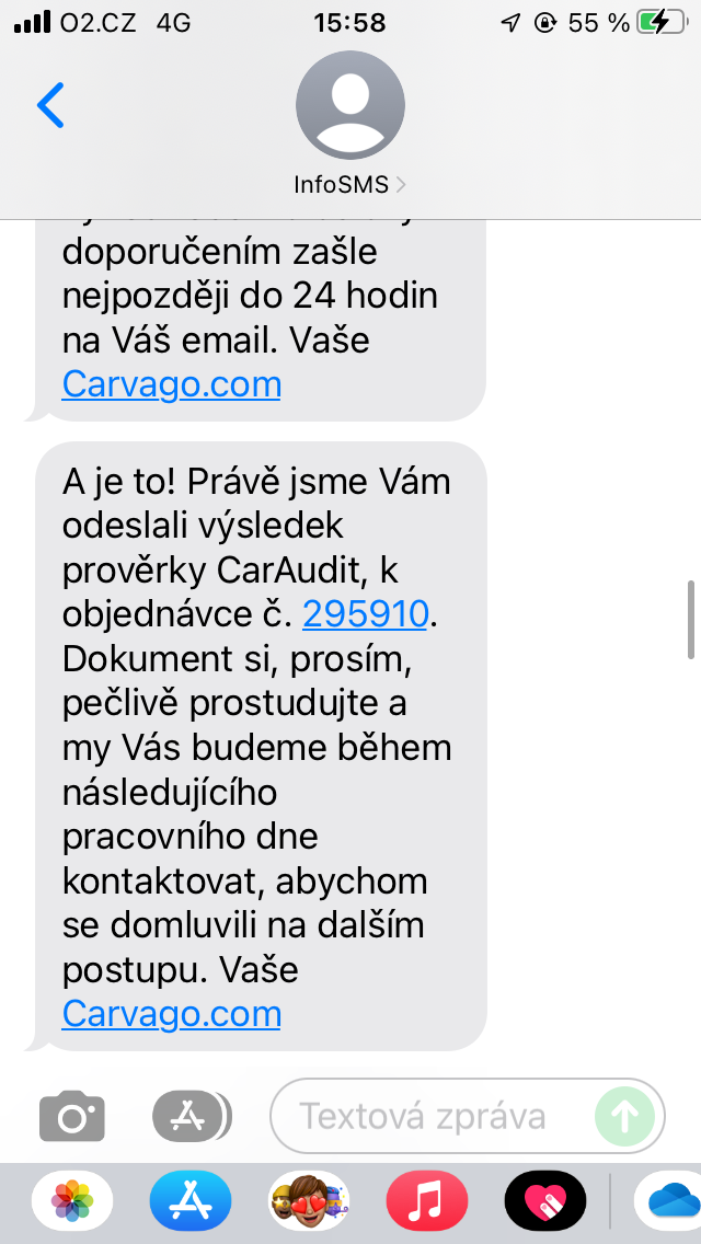 Zároveň chodí SMSky (taky posílám ukázku), kde jsou trošku podrobnější informace o tom, co se s autem zrovna děje a v "klíčových" momentech i volá pracovník s informacemi o aktuálním stavu objednávky. Taky přikládám fotky. CarAudit jsem si zadal 13.04.2023 a auto jsem si vyzvedl 26.05.2023, ale v Praze bylo už 22.05.2023.