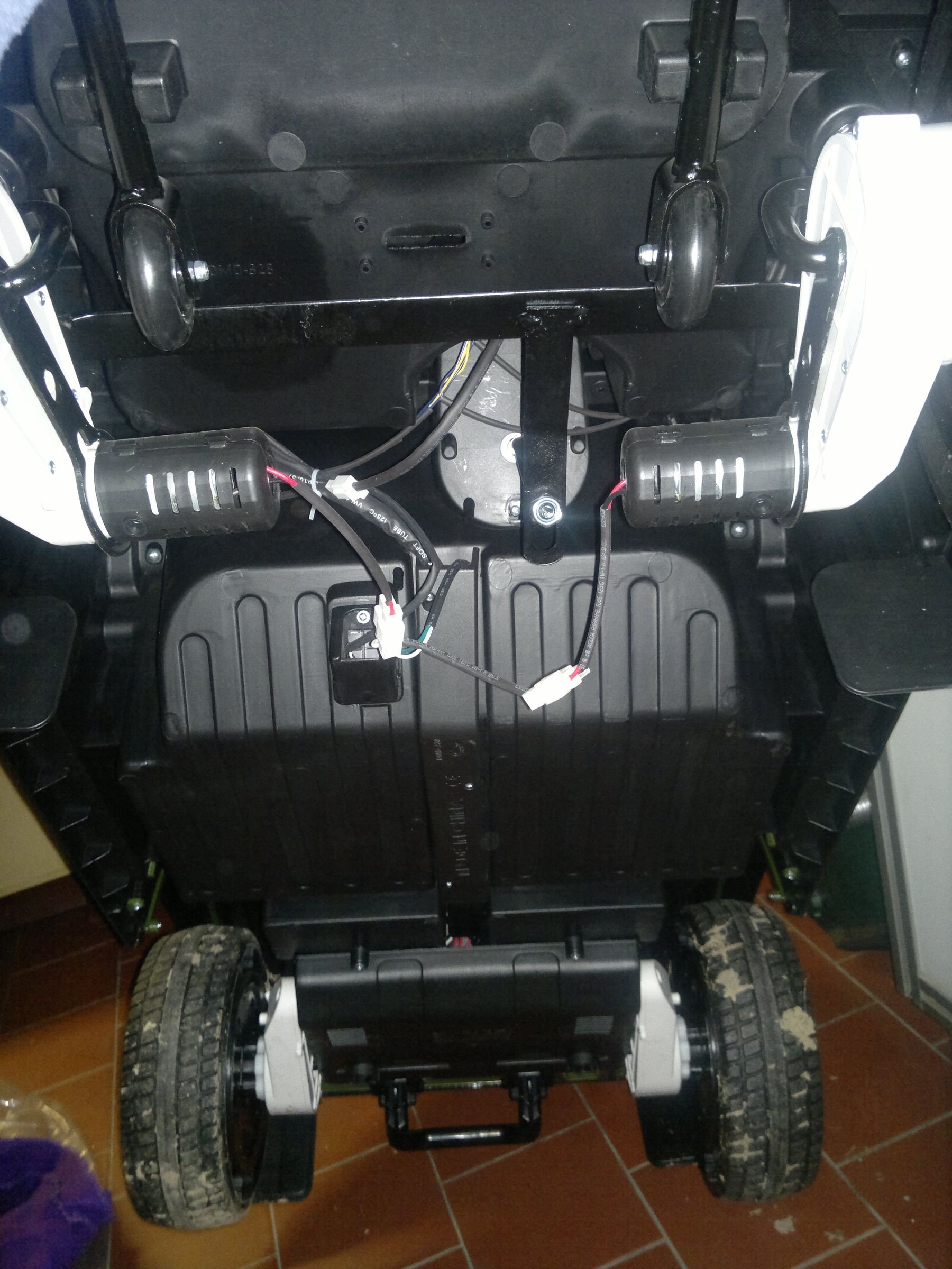 Tady už je učesaná nová kabeláž. Původní silové vodiče AWG18 (0,8mm2) vedoucí od aku k vypínači a zpět k řídící desce (a plus ty kostrové od aku k desce) jsem nahradil vodiči AWG12 (3,3mm2). Už dříve jsem na těch původních měřil za jízdy úbytky a nic významného jsem nenaměřil, takže jsem očekával hlavně přínos v mechanické odolnosti tlustších drátů. Když už jsem to dělal a byly po ruce... no ale ukázalo se, že to má sakra vliv. Defík je teď živější, hravješ vyjede kopečky na zahradě a je i vidět na palubním multimetru, že napětí v záběru nepadá tak dramaticky jako dřív. A to jsou tam pořád starší jeté akumulátory.