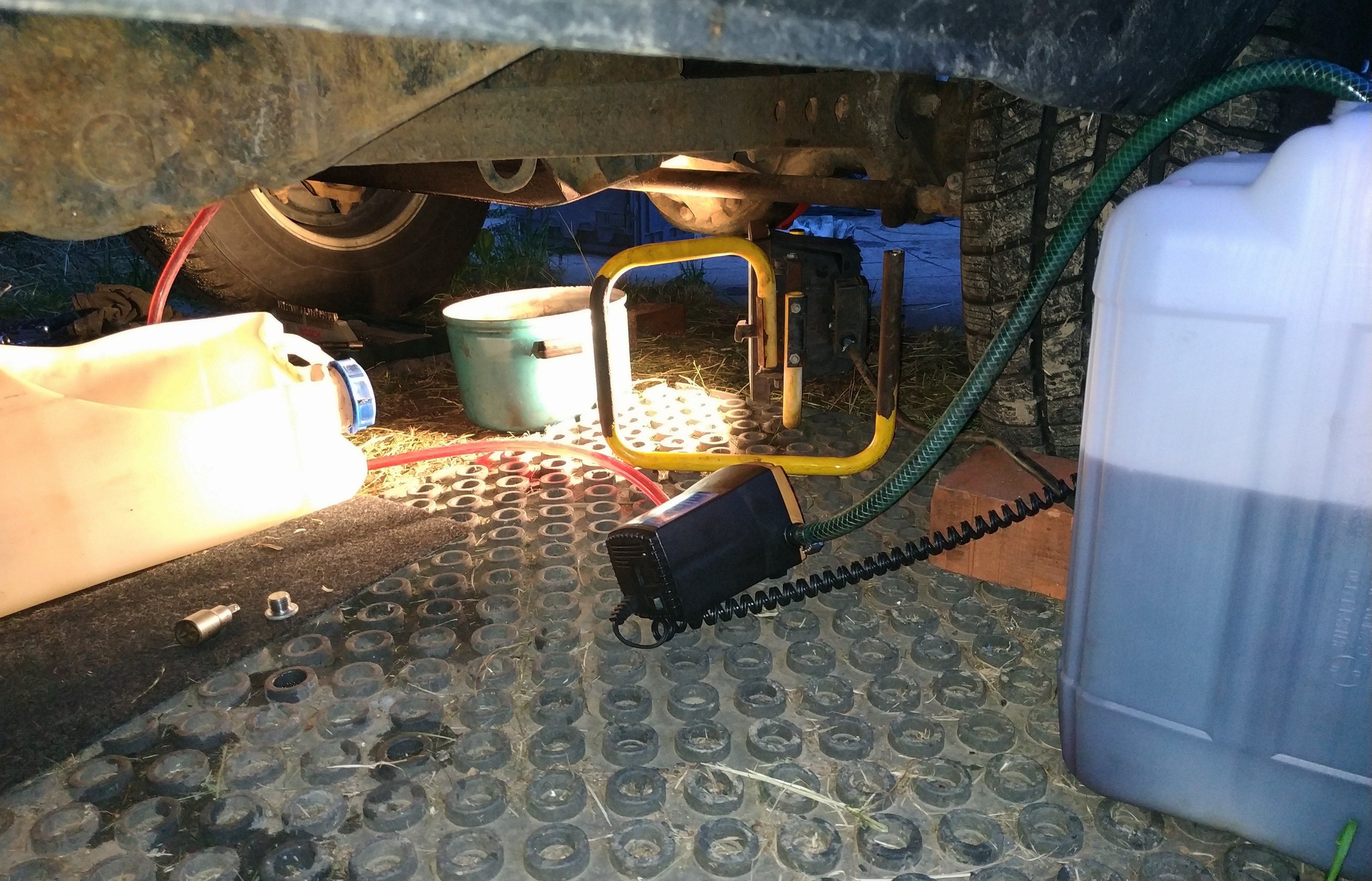 TIP: nový olej lze sice napouštět například velkou 0,3L stříkačkou, ale při tak velkém množství to zabere dost času. Já jsem si pořídil (celkem levně) malé, olejové, elektrické čerpadlo na 12V, které je schopno napustit kontrolovaně vypínačem převodovku za pouhé 3 min. Nespornou výhodou je fakt, že nepotřebujete elektřinu z 220V zásuvky a olej můžete měnit v polních podmínkách.
