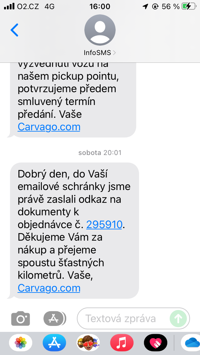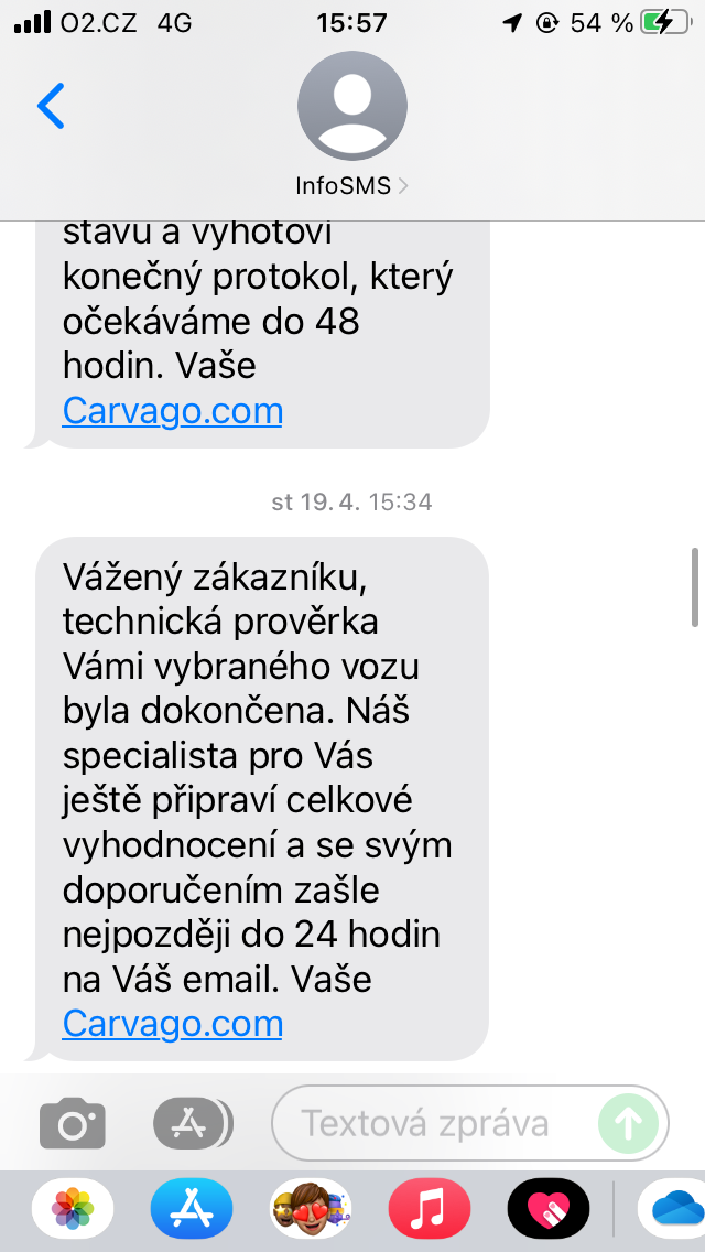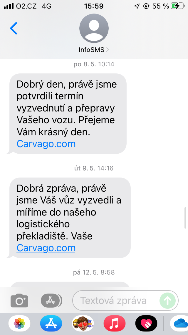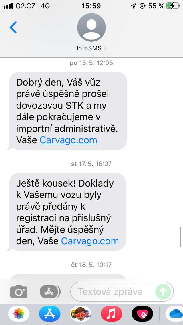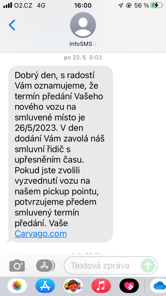 Zároveň chodí SMSky (taky posílám ukázku), kde jsou trošku podrobnější informace o tom, co se s autem zrovna děje a v "klíčových" momentech i volá pracovník s informacemi o aktuálním stavu objednávky. Taky přikládám fotky. CarAudit jsem si zadal 13.04.2023 a auto jsem si vyzvedl 26.05.2023, ale v Praze bylo už 22.05.2023.
