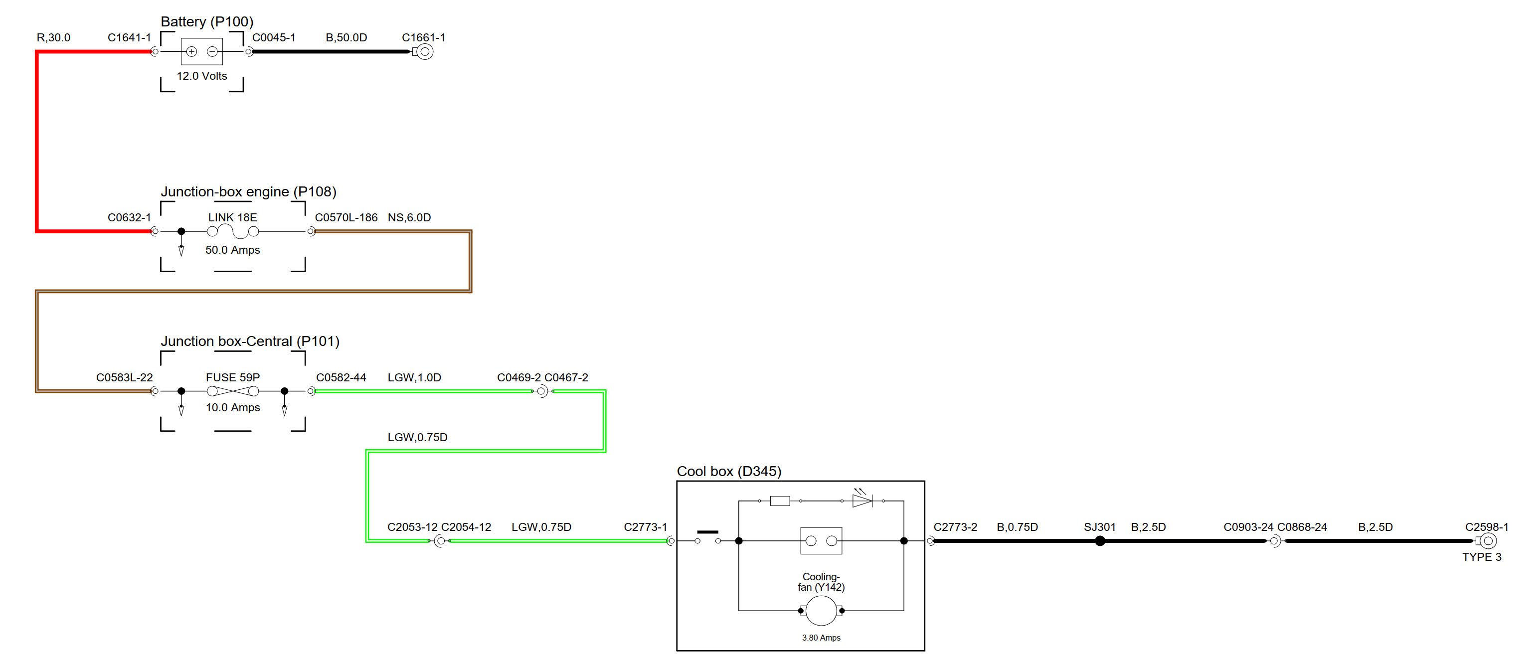 Podle schématu je připojený přímo k akumulátoru, elektronika chladničky jen hlídá, aby jej nevycucla a včas se odpojí.
