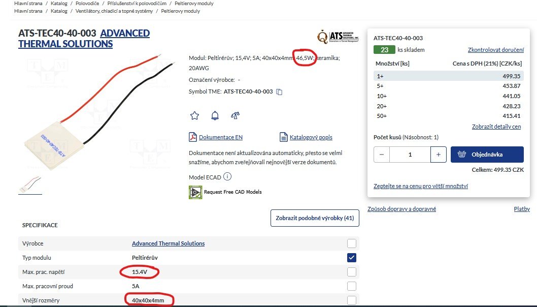 Peltiery se dají snadno sehnat, stačí jen vybrat správný rozměr a hlídat základí parametry - napětí cca 15V (při 12v bude žrát a chladit míň), max proud a příkon. Dají se sehnat i za stovku
