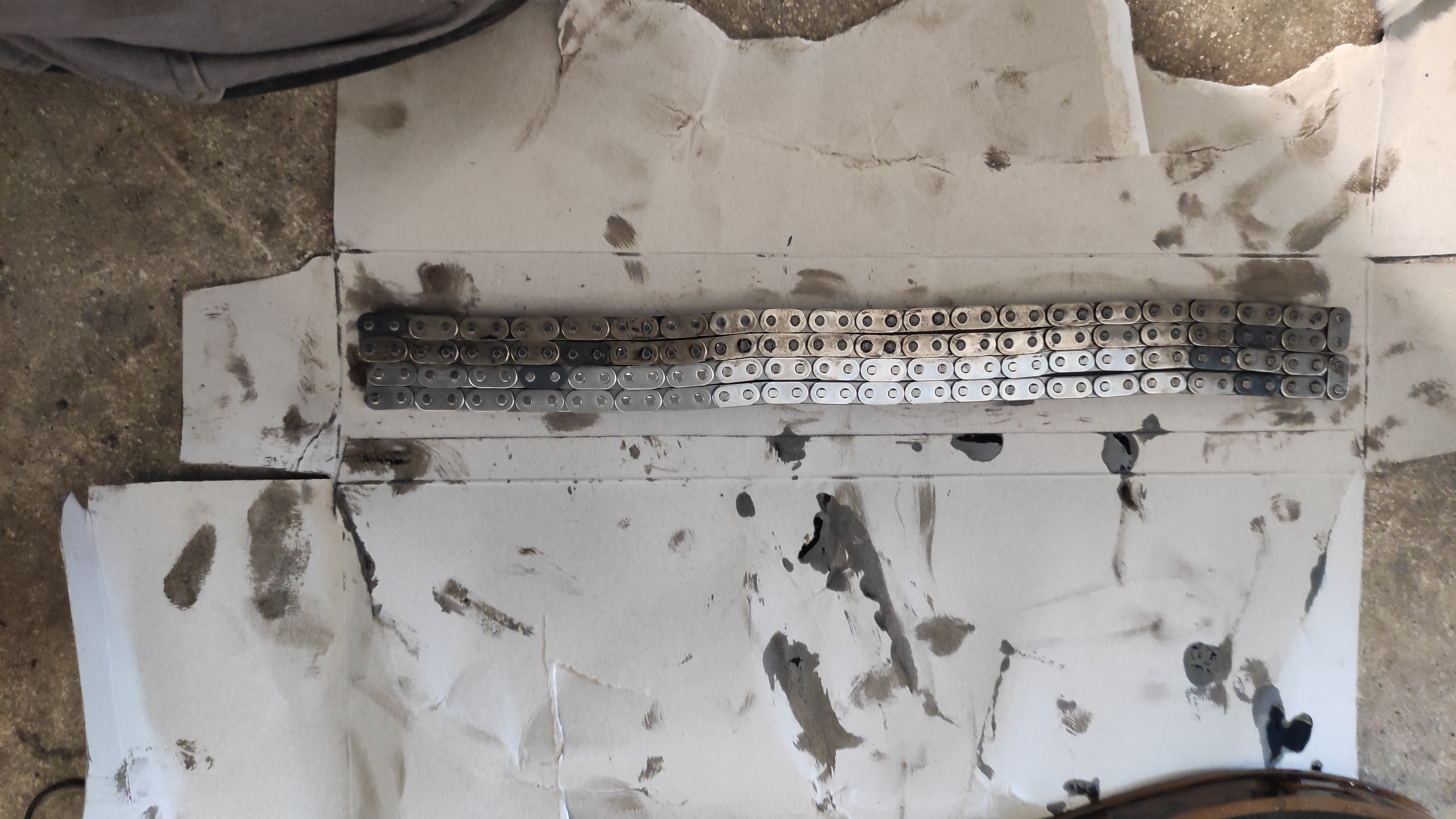 Čo ma však trápi doteraz je rachotanie. Po štarte sa ozývalo najprv kratko neskor aj za tepla. Takže som si z vtedy jedného dostupneho zdroja (island 4x4) objednal rozvodovu sadu a rozvody vymenil. Ozubené kolieska boli nedostupné takže som ich nechal pôvodné, na pohľad bez poškodenia. Nové boli reťaze, napinaky a klzáky. Na foto dole je porovnaná nová a pôvodná reťaz. No rozdiel mi nepríde výrazný.