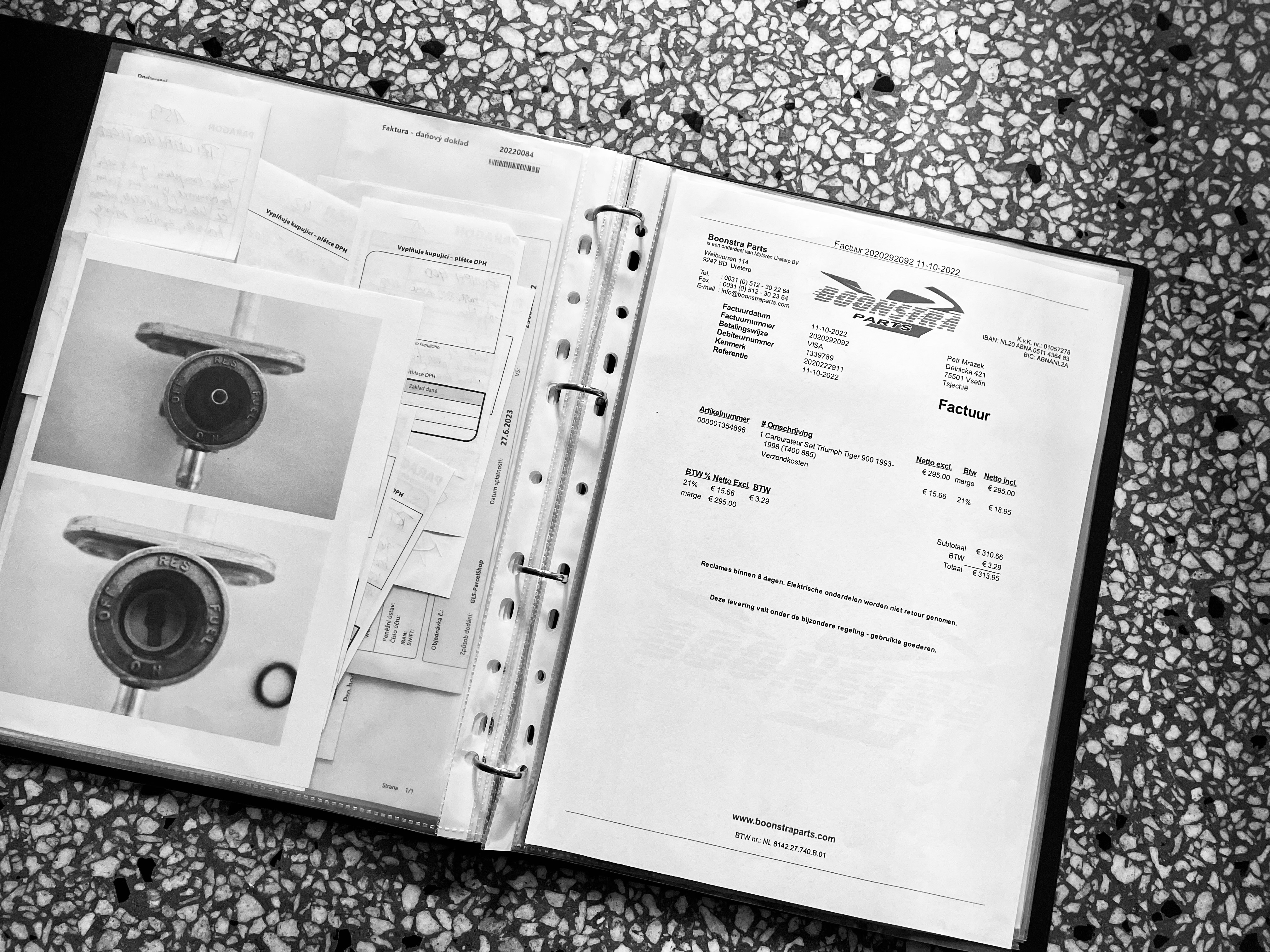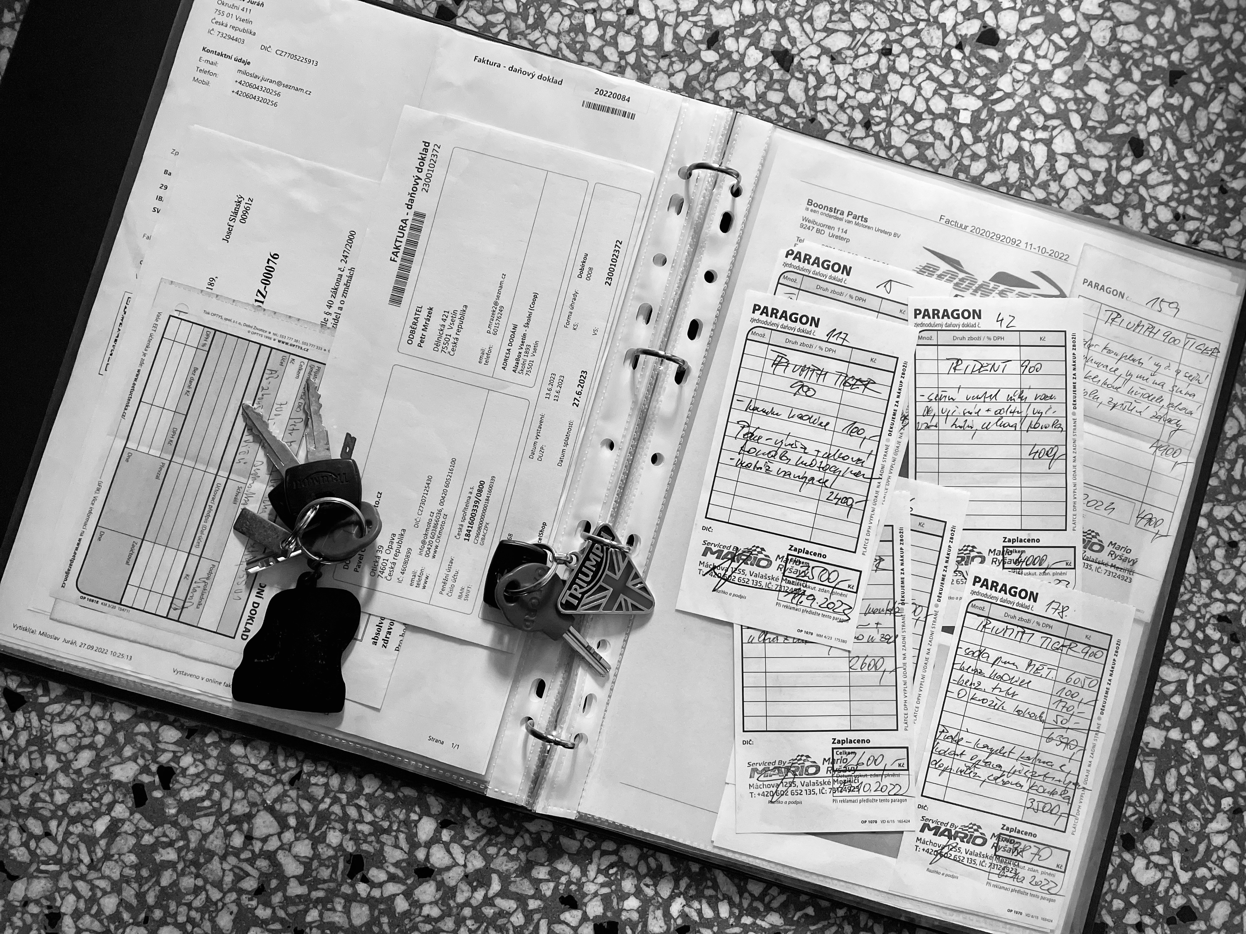 K motorce mám některé původní díly (plexi, karburatory,…) a další nové (klaksony Triumph, těsnění,…)