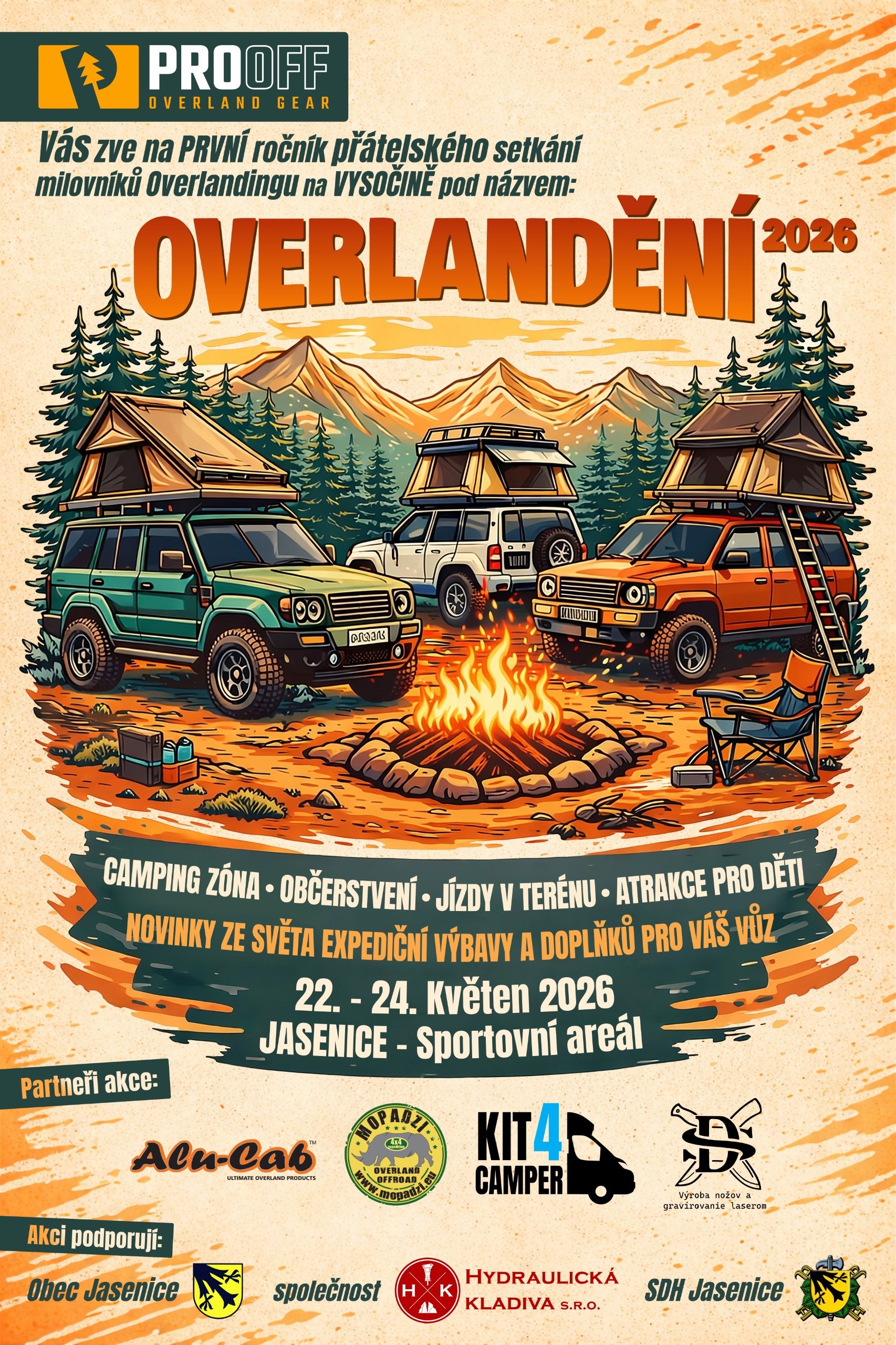 ​Máte teréňák, dodávku, nebo jen milujete svobodu cestování? Přijeďte za námi do sportovního areálu Jasenice! Čeká nás víkend plný pohody, zábavy, aut, a hlavně – kompletní přehlídka toho nejlepšího vybavení a doplňků pro cestování od Prooff, MOPADZI, KIT4 CAMPER. Workshop Dexter, RC modely a další. .