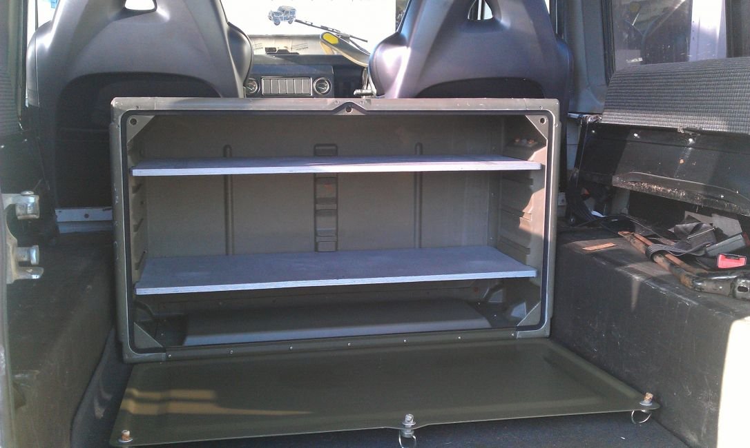 Prodám bednu Laycorn, rozměry jsou 89 x 51 x 34 cm, tj. pasuje buď na zadní podběh/lavici v defíku, nebo mezi podběhy na korbu. Je (nejspíš) vodotěsná, pod víkem je těsnění. Je velmi bytelná až nezničitelná, z nějakého silného plastu, s plechovým víkem se otočnými zámky ve třech místech.