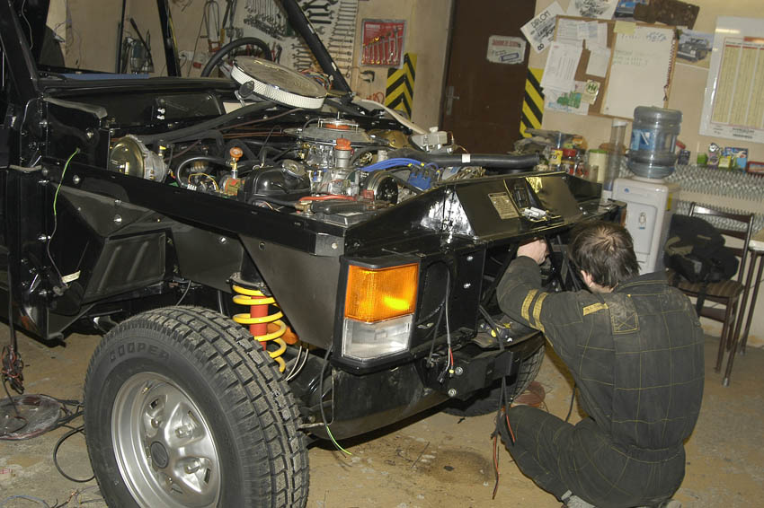 Nejdříve se položila podlaha po celé délce interiéru a začalo se s jejím odhlučňováním a pokládáním koberců. S pokračování elektro-instalace přibyly nejdřív přední blinkry s parkovačkami, poté zadní lampy a nakonec i hlavní světla. Všechny lampy jsou nové. V hlavních reflektorech se usídlily xenony, na a pod předním nárazníkem ještě budou přídavná dálková světla a mlhovky. Chladič klimatizace se zkulturnil, chladič motoru je nový a sekunduje mu dvojice elektrických větráků Kenlowe. Obojí již dnes bylo na autě. Za maskou je nově také chladič převodového oleje (ještě bude docela honička s jeho napojením na převodovku) a za nárazníkem bude chladič motorového oleje. Vzhledem k novým přístrojům a kontrolkám Kryten vymodeloval z ocelového plechu novou kapličku před volant. Dnes jsme jí osadili a zapojili. Všechno funguje na jedničku. Ještě před tím kluci osadili klimatizační jednotku. Zbývá přidat její povrchový panel s výdechy.