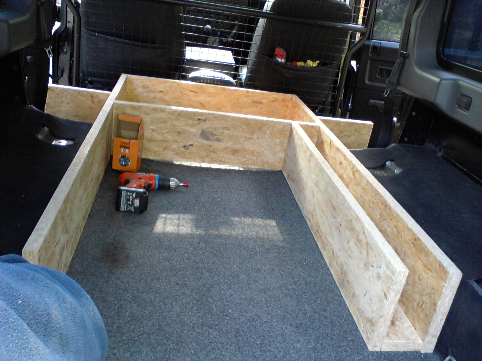 Tak sem se do toho taky pustil. Nutno uznat že prvně sem si myslel, že v pondělí začnu a v sobotu už budu na fesťáku spát v autě. Teď je konec září a to znamená už druhej měsíc od začátku. S přestávkama po večer a odpolednách sem na tom strávil dost času. No.....k věci. Celý je to 2cm tlustá dřevotříska, inspirace Rosomák a LubošM tedy bedny na blatníkách místo lavic. Mezi nima deska až po zadní sedačky. Zadní sedačky lze za jízdy používat a pro spaní se na ně dává dělená deska opřená o tyto složené sedačky. Celý natřený černou matnou, zvrchu polepený kobercem. Mimo to že sem si vyřešil ložnici do auta, tak sem zlikvidoval cajk v bedně v kufru, lékárničku, vestu, lana, šekly a kurtny pod sedačkou všecko do těch super beden.