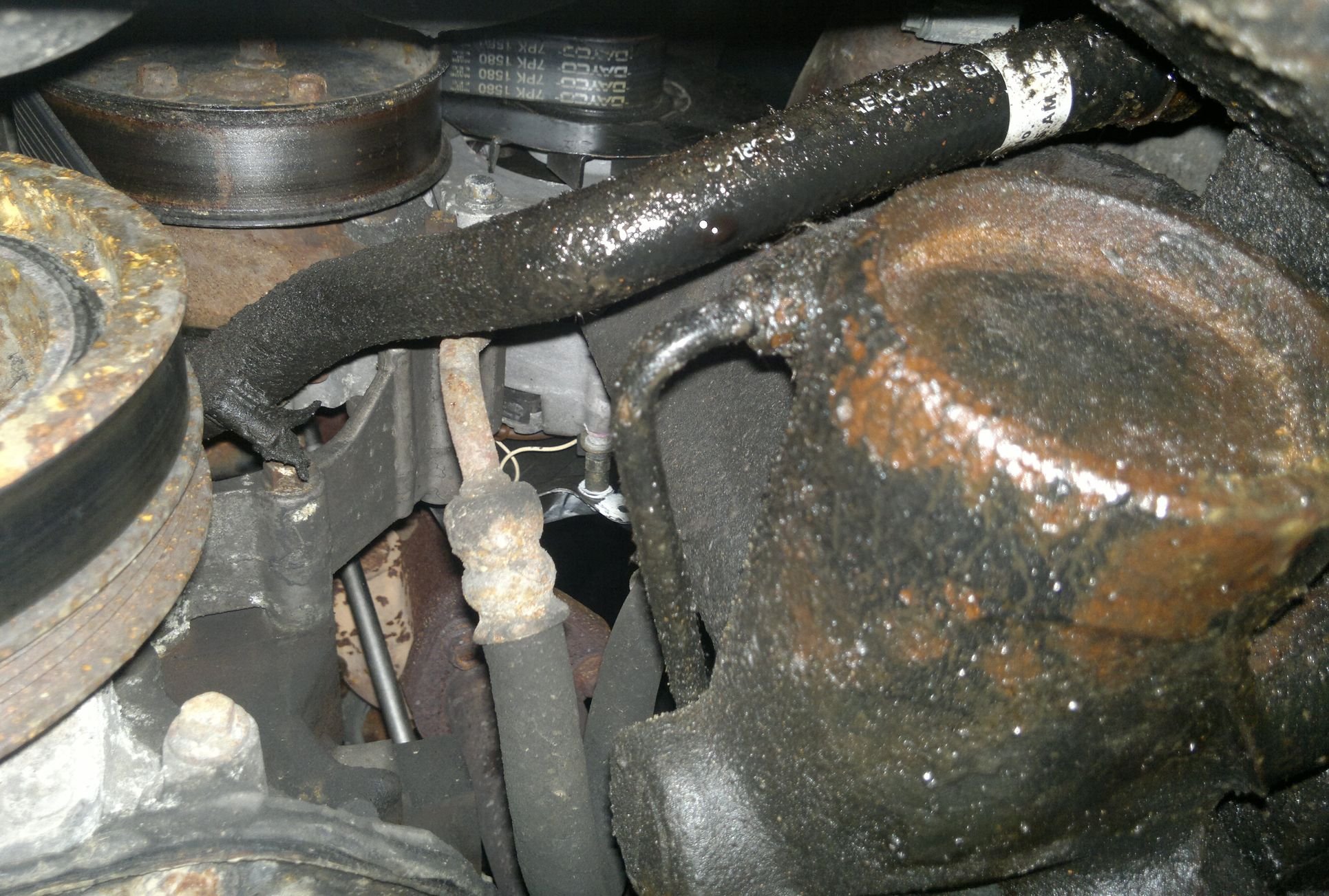Po průběžném očišťování jsem nakonec vystopoval, že únik zřejmě pocházel od jedné z hadic napojených k nádobce. Po ní to stékalo dolů a zbytek rozprášil ventilátor. Hadici jsem povolil, zakroutil a protože prasklinu nevykazovala (ani nátrubek na nádobce), tak jsem jen znova dotáhnul sponu. Uvidí se.