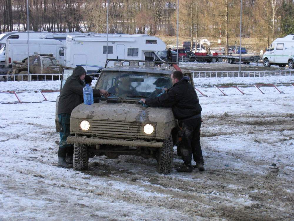 No bylo to peklo. V patek nam pri testovani 4x4 kdyz jsme zjistovali proc to jede jen na predek strelil sroub z vodni pumpy a vytekla komplet voda. Samozrejme i se zavitem, takze se to zalepilo silikonem a privarilo se to, no a pak jsme kuchali komplet zadni diferak s poloosama venku kdyz mrzlo. No a v sobotu dopoledne, kdyz se zacli sjizdet vsichni zavodnici a my meli auto postavene na rezervach s vykuchanou napravou, tak nikdo moc neveril ze jeste ten den pojedem