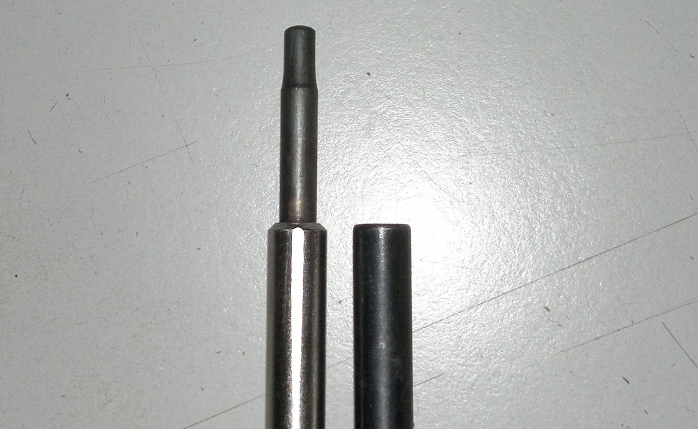 Jenže jak z toho ven ? Na rozšířené části žhavícího kolíku jsem naměřil průměr 4,98mm, takže ideální pro vrták pr.5. Jenže. Komůrka je hluboká a normální vrták krátký a nechtěl jsem riskovat, že mi zahučí dovnitř. A navíc při uchycení do držáku tam vadí podstavec šroubu hlavy. Extra dlouhý jsem neměl. Jehlový pilník už sem měl v ruce, ale přišlo mi to jako brutalita. Nakonec přišla spása v podobě vrtáku se stupňovitou špičkou, 8,5ka má na jednom ze stupínků průměr přesně 5mm a navíc se dá zasunout do komory takřka na těsno, takže se i vystředí. Haleluja.