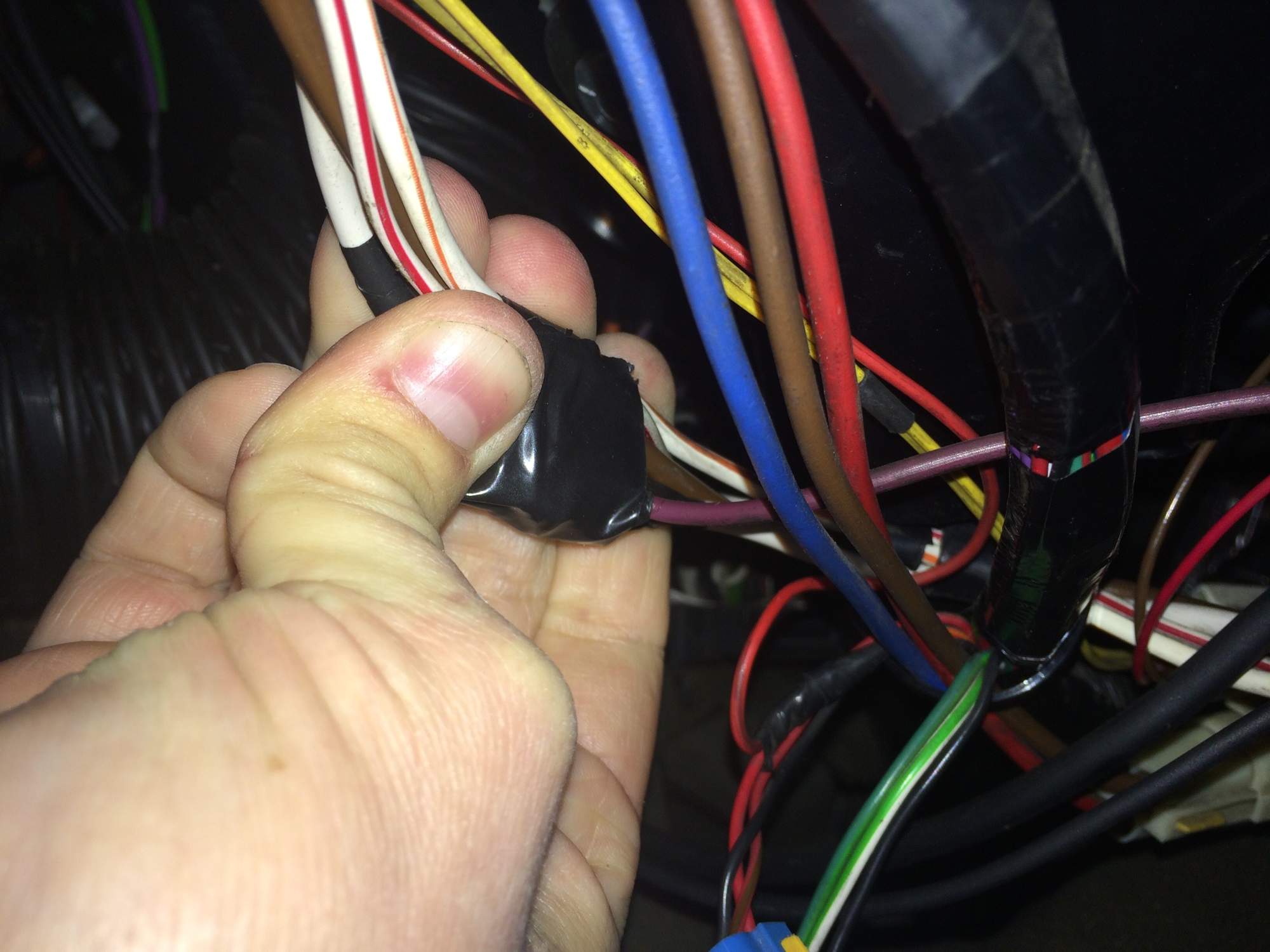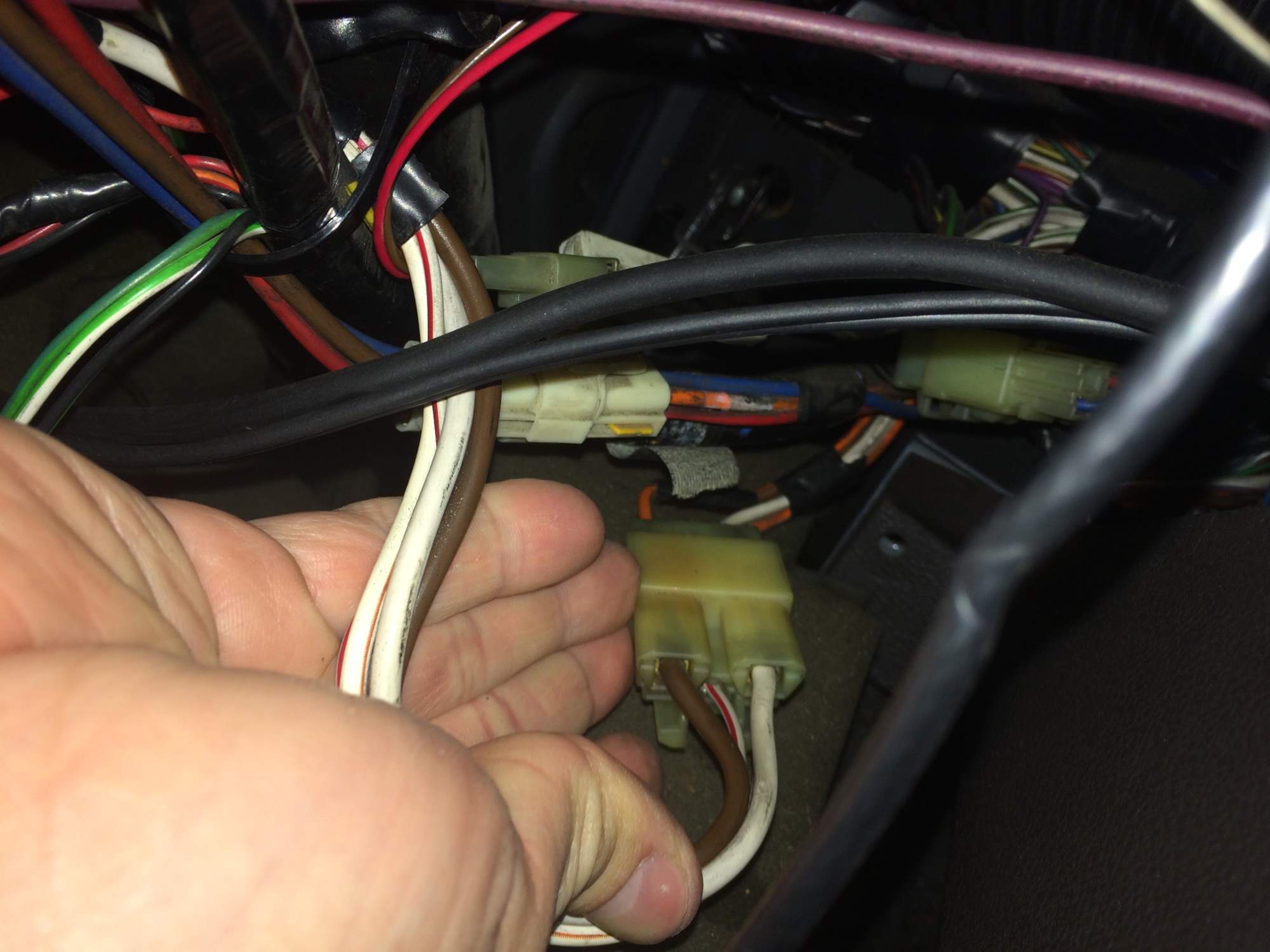 tak jsem byl zas po tmě lovit fotky.....takže jako bastl tam vypadá jen ten fialový drát a ten je z tajného tlačítka. Ten půjde pryč. no a pak vedou kabely do toho nažloutlého konektoru a vypadá to normálně.