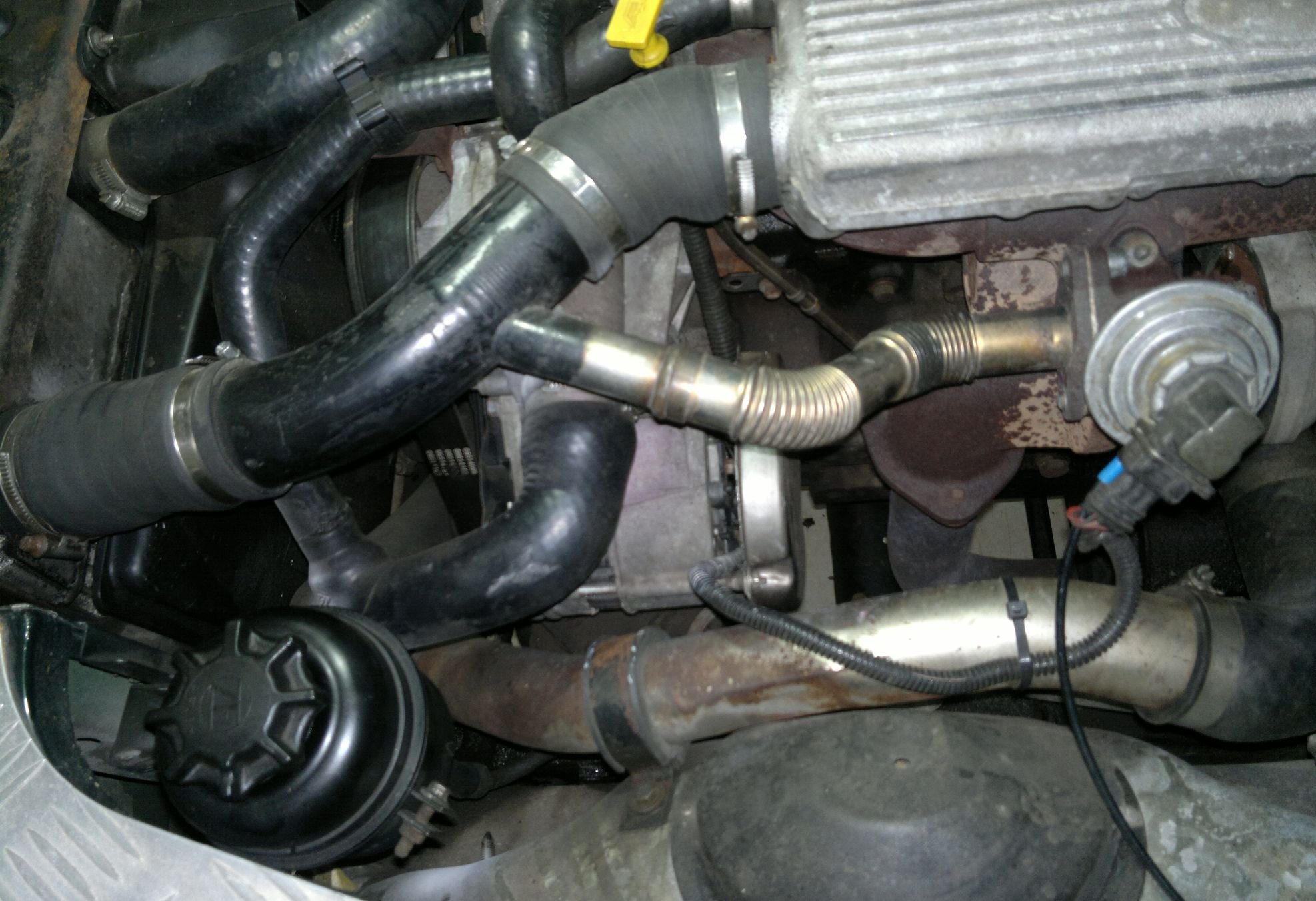 Proč nešla vytáhnout z hadicové spojky trubka vedoucí od turba do intercooleru ? Protože byla zarezlá do gumové hadice ! Voda po ní stéká krásně dolů pod gumu a sponu a tam si lebedí. Naštěstí po okartáčování nebyla nikde skrz, tak jsem jí aspoň ošetřil nerezovým nástřikem.