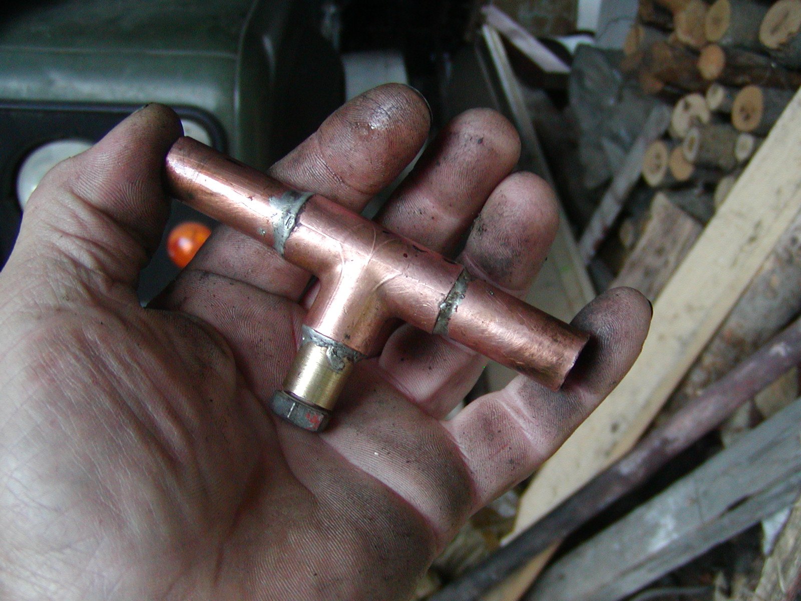 Nic složitýho .Měděný T a dvě měděný trubičky do toho zasunutý a spájeno cínem ,viz foto .Koupil jsem to v Hornbachu -topenářský potřeby